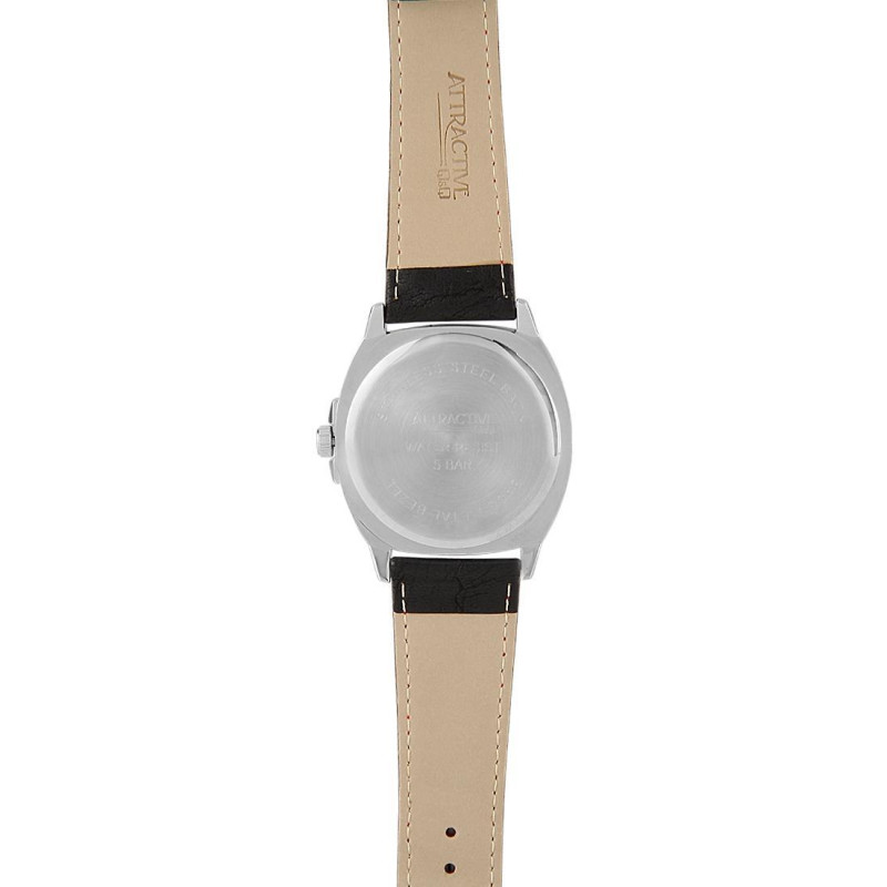 Чёрный кожаный ремешок. Корпус стального цвета. Цвет циферблата — чёрный. Вид циферблата — индексы...