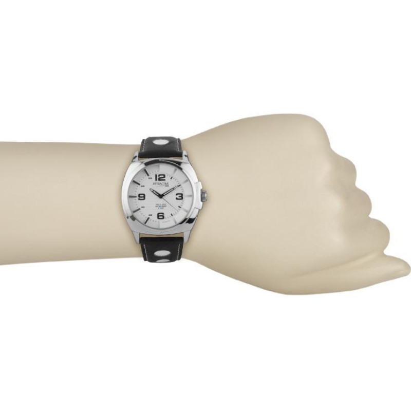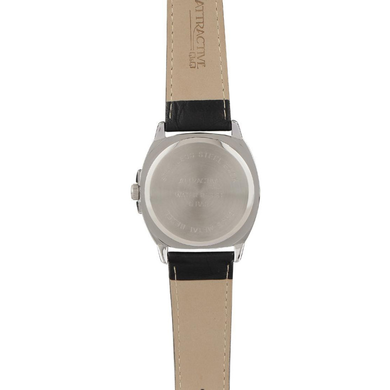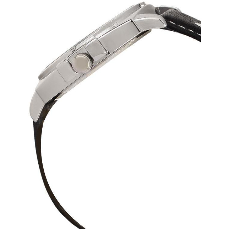 Чёрный кожаный ремешок. Корпус стального цвета. Цвет циферблата — белый. Вид циферблата — индексы и ..