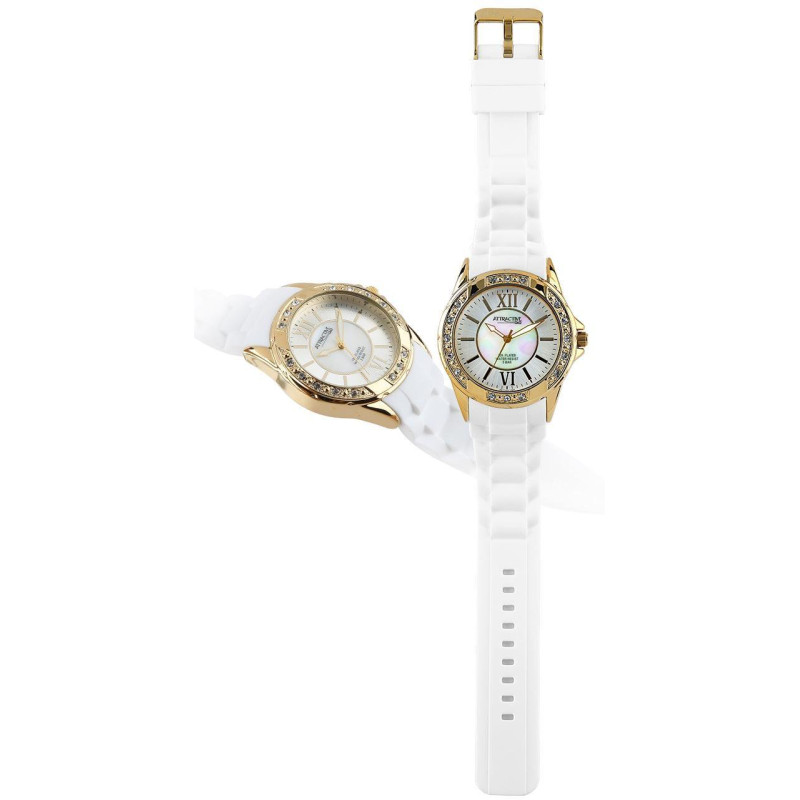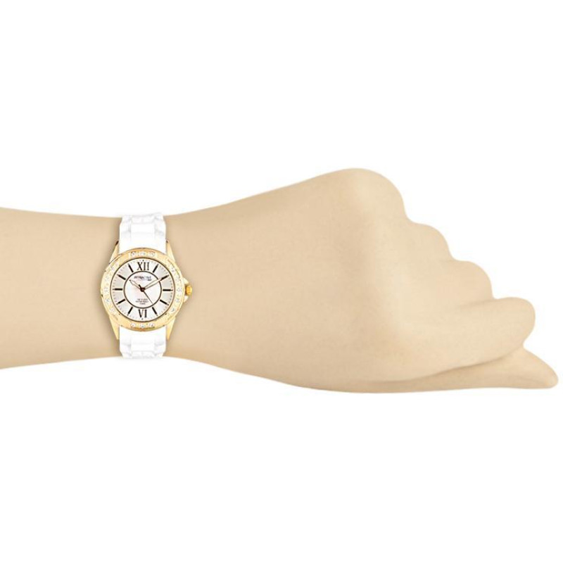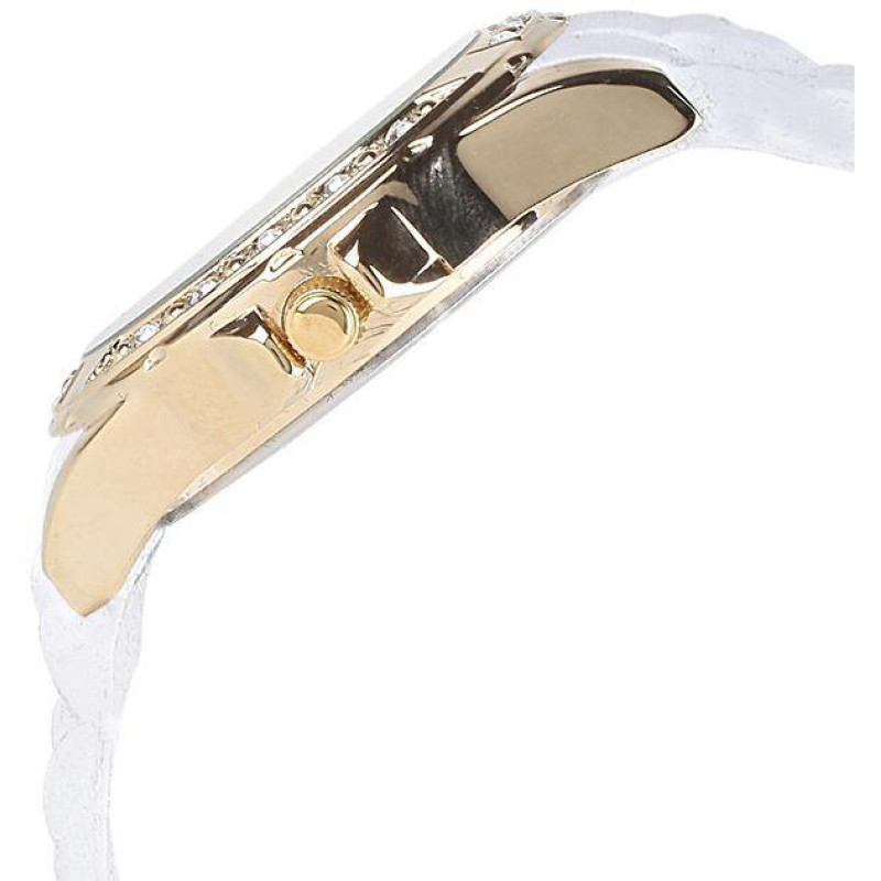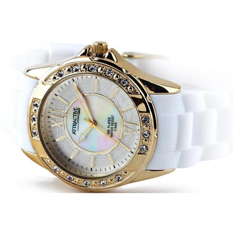 Люминесцентные стрелки. Белый силиконовый ремешок. Корпус покрыт PVD-покрытием золотого цвета и укра..