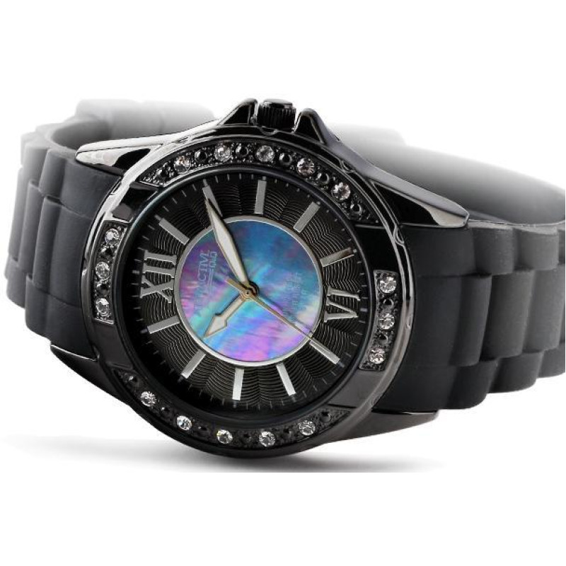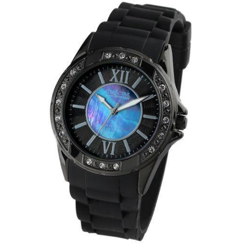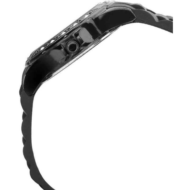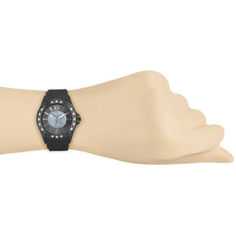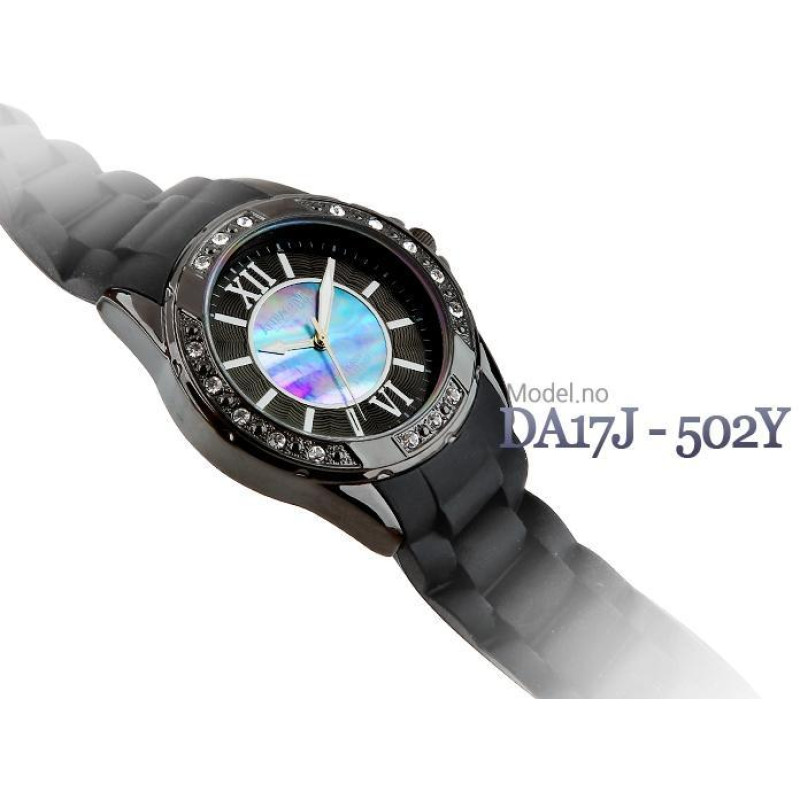 Люминесцентные стрелки. Чёрный силиконовый ремешок. Корпус украшен фианитами. Цвет циферблата — перл..