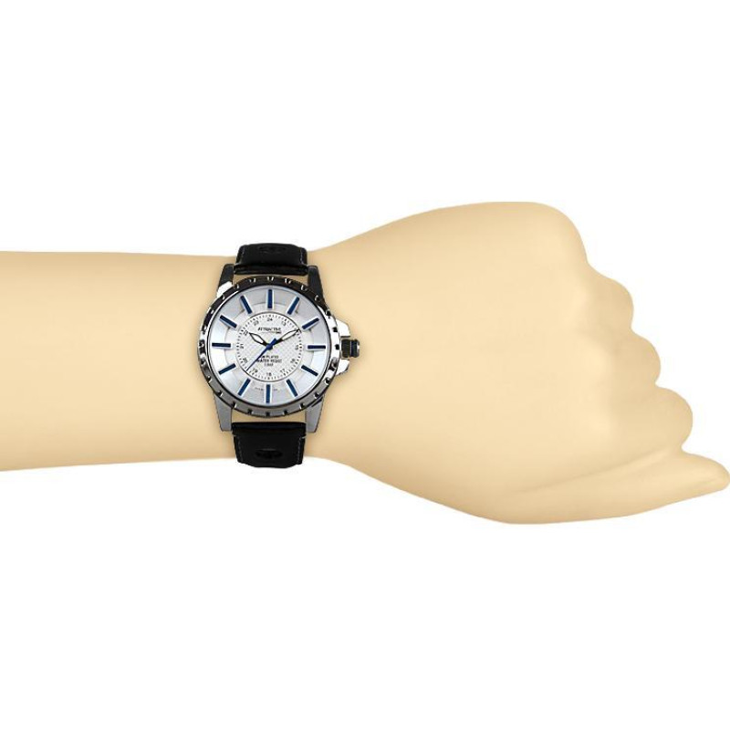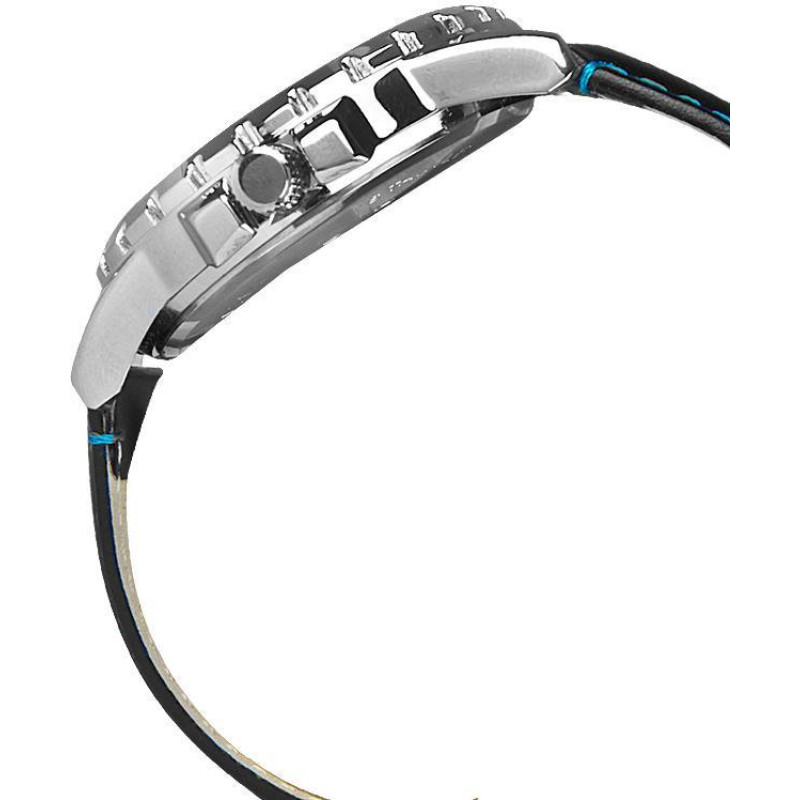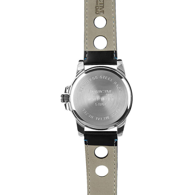 Чёрный кожаный ремешок. Корпус покрыт чёрным PVD-покрытием. Часовая и минутная стрелки с люминисцент..