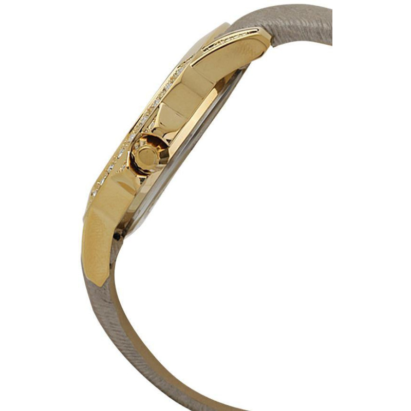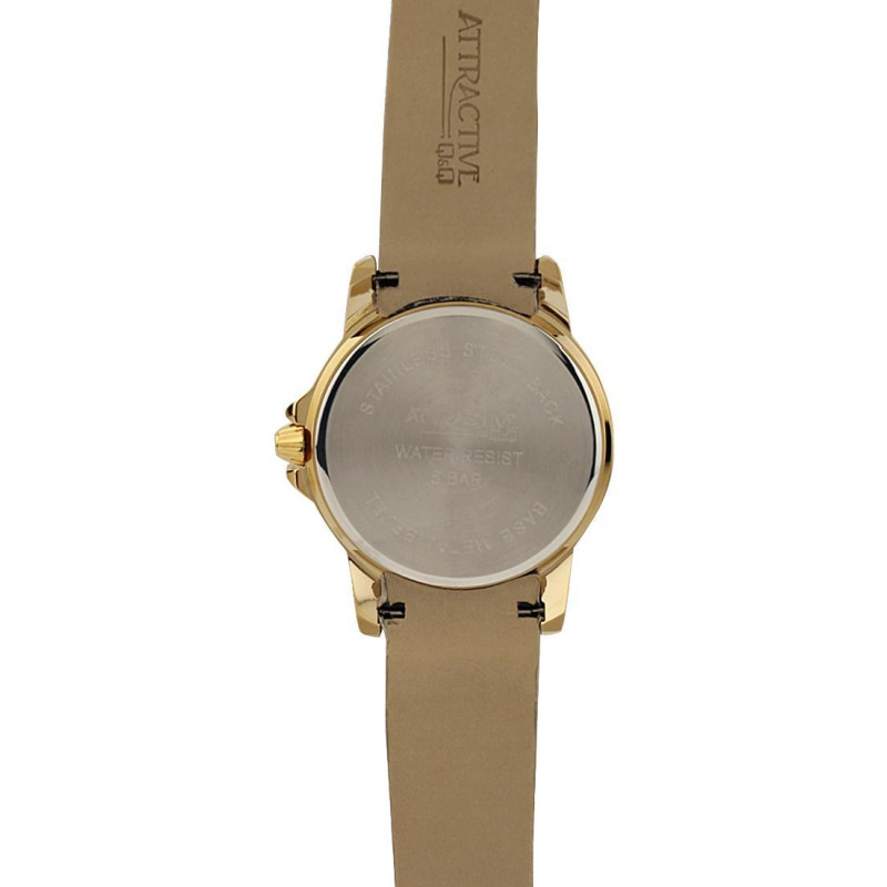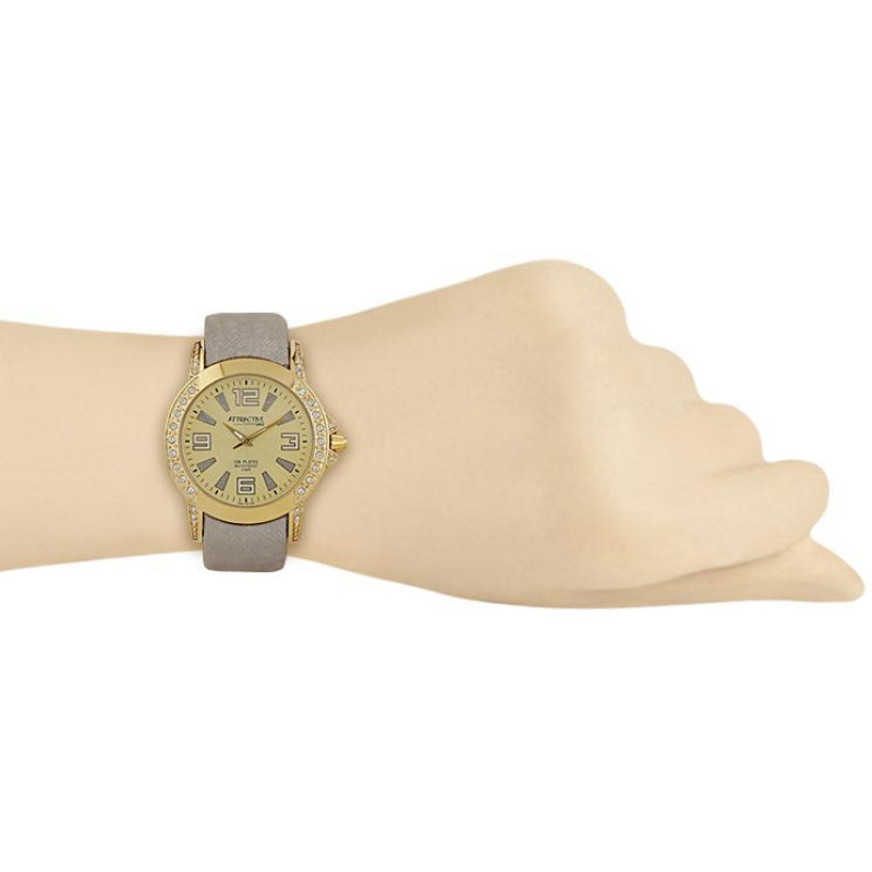 Люминесцентные стрелки. Серый кожаный ремешок. Корпус покрыт золотым PVD-покрытием и украшен фианита..