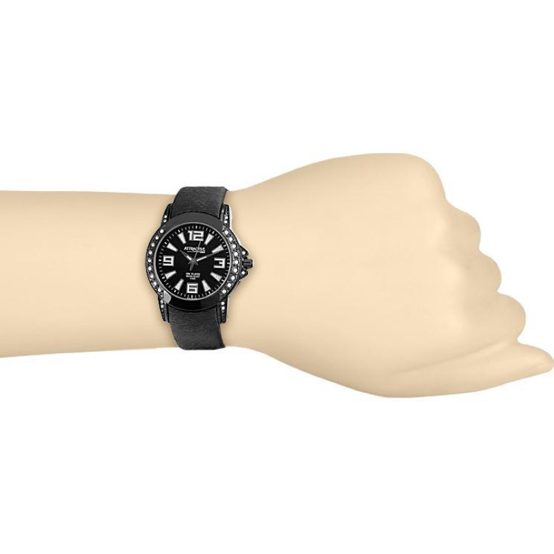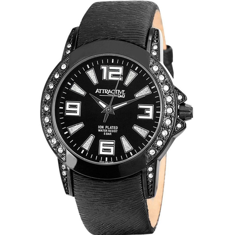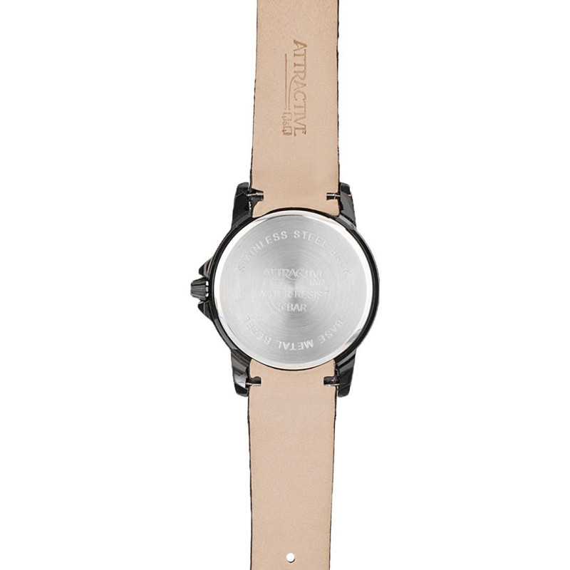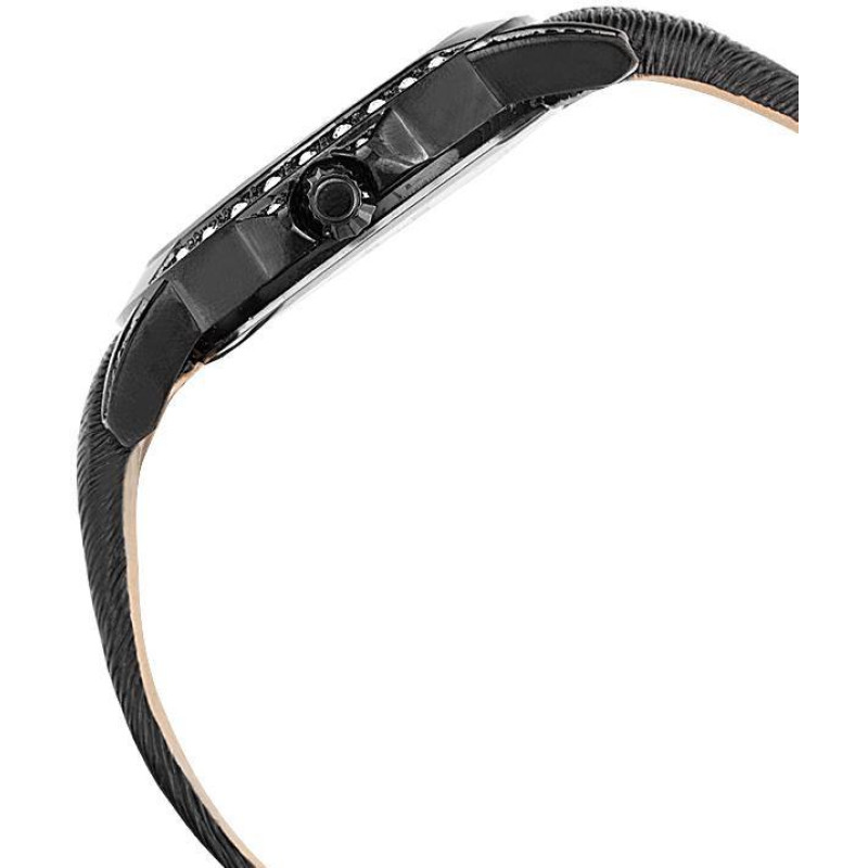 Люминесцентные стрелки. Чёрный кожаный ремешок. Корпус покрыт чёрным PVD-покрытием и украшен фианита..