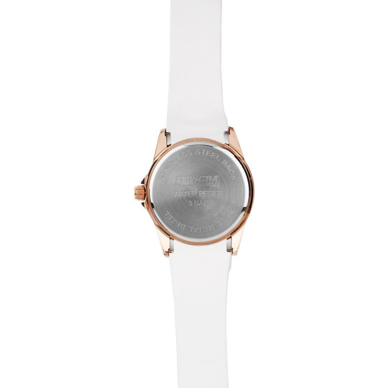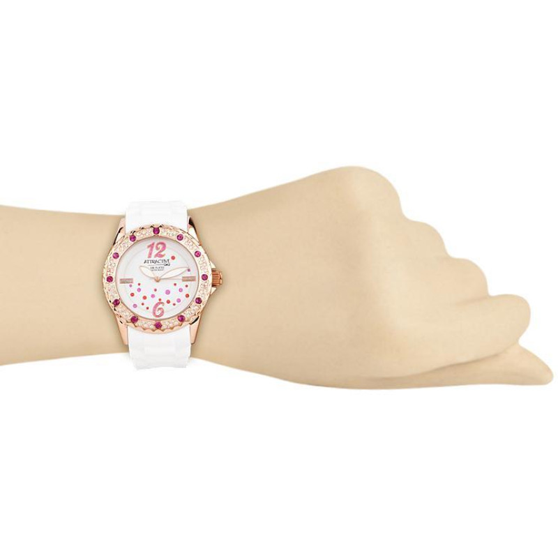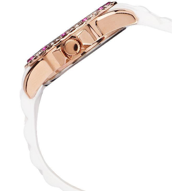 Люминесцентные стрелки. Белый силиконовый ремешок. Корпус покрыт золотым PVD-покрытием и украшен фиа..