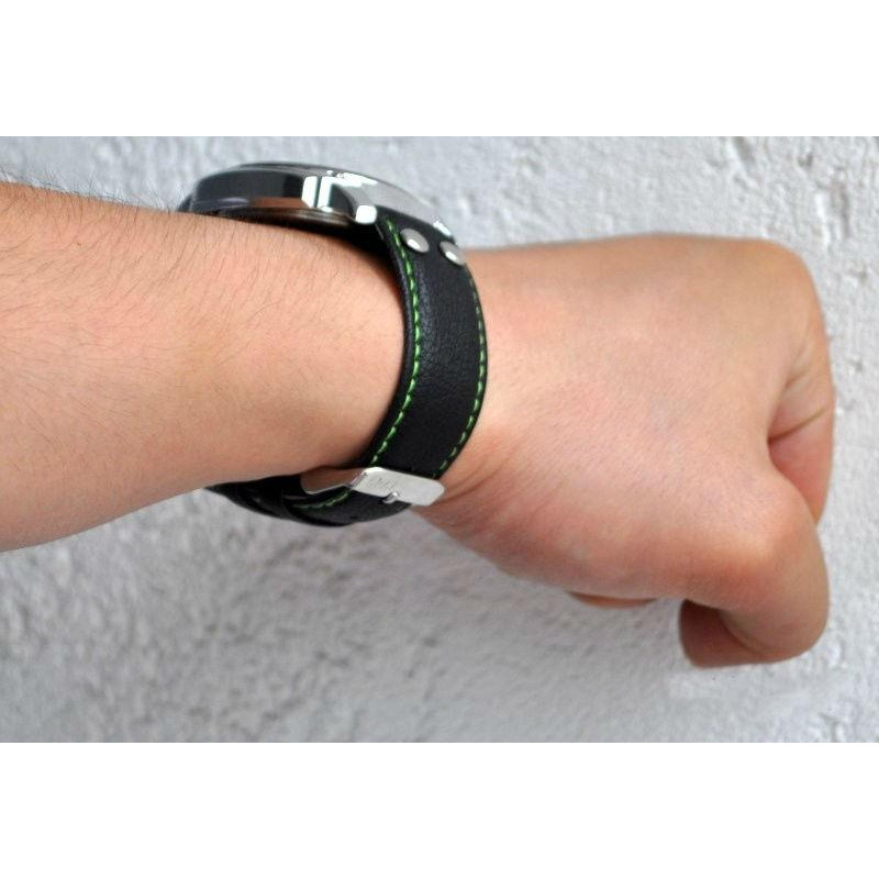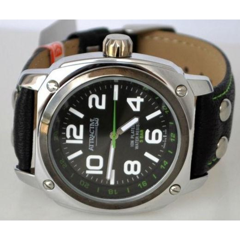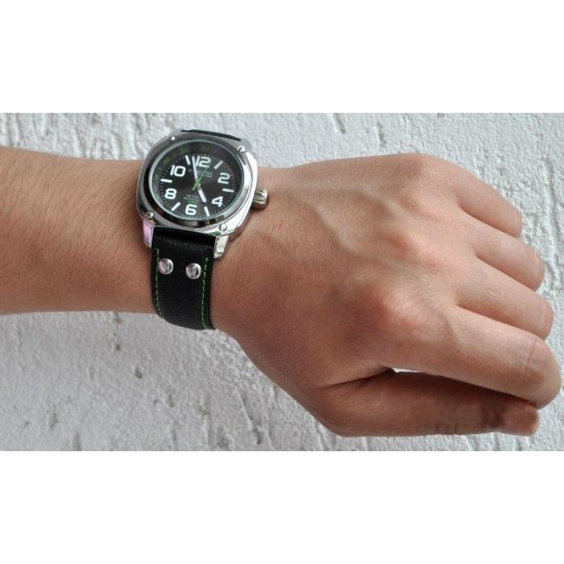 Люминесцентные стрелки. Корпус серебристого цвета. Чёрный кожаный ремешок. Есть дополнительная шкала..