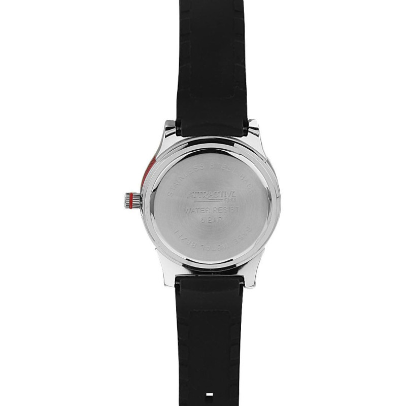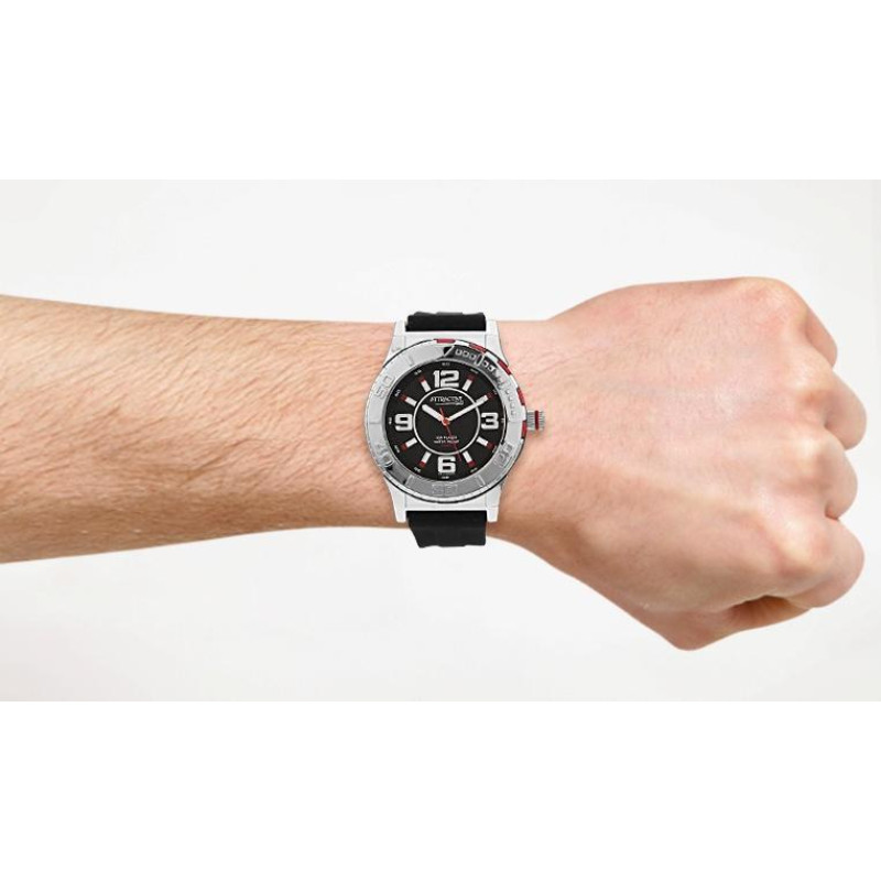 Люминесцентные стрелки. Корпус серебристого цвета. Чёрный силиконовый ремешок. Цвет циферблата — чёр..