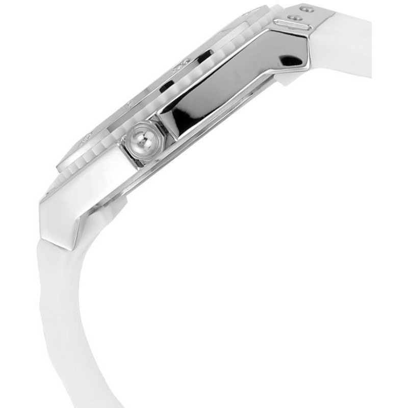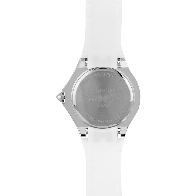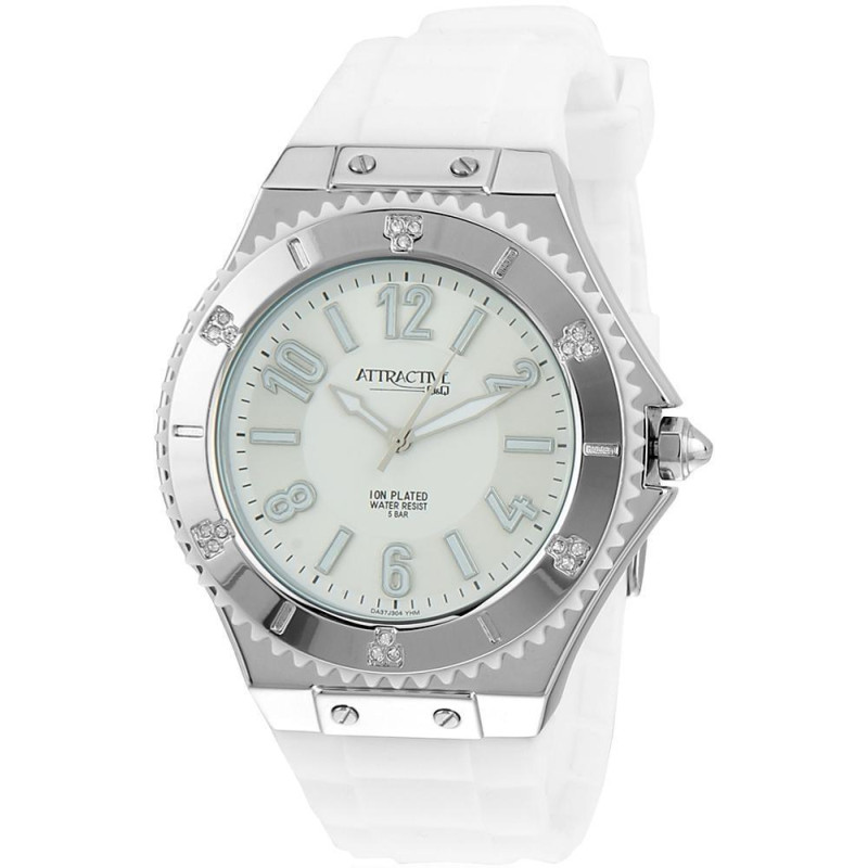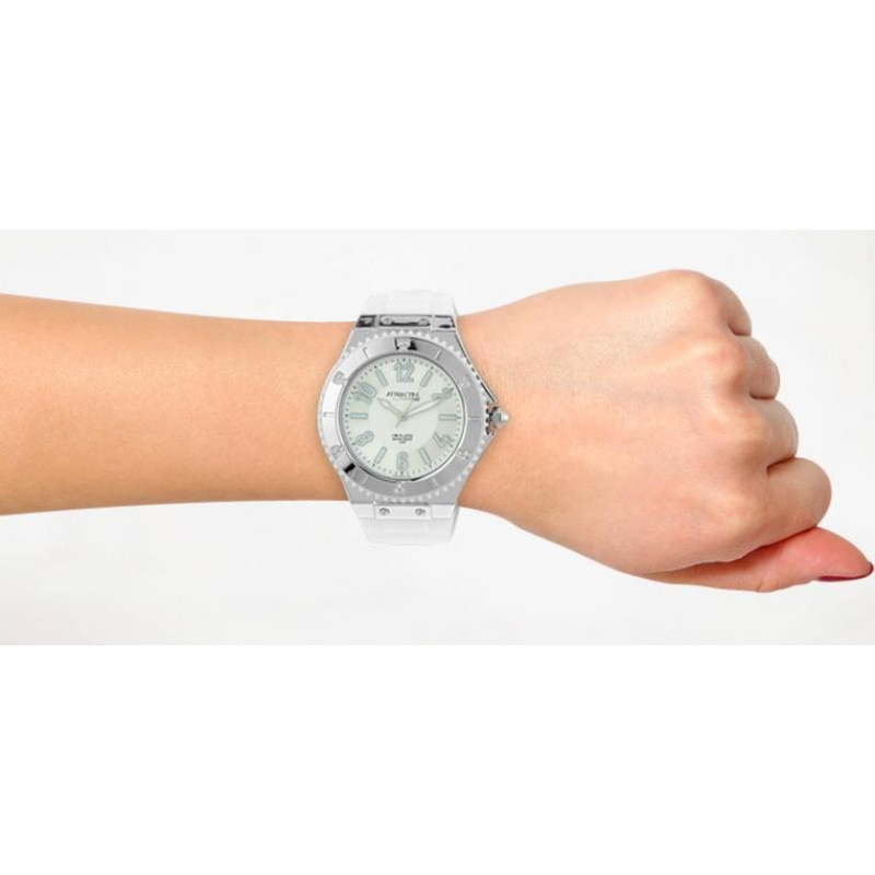 Люминесцентные стрелки. Корпус серебристого цвета, украшен фианитами. Белый силиконовый ремешок. Цве..