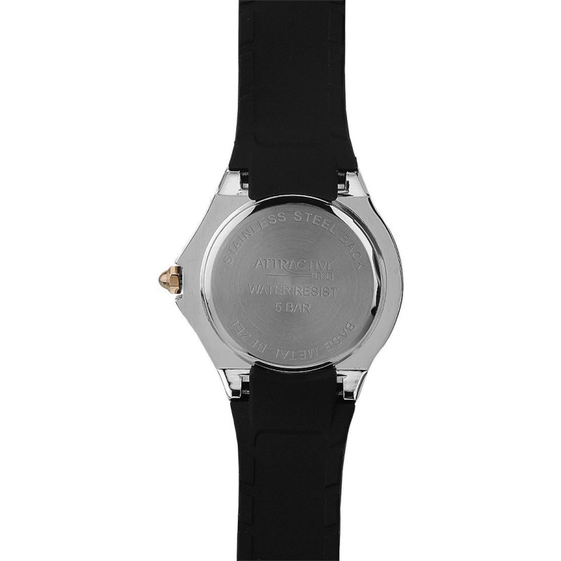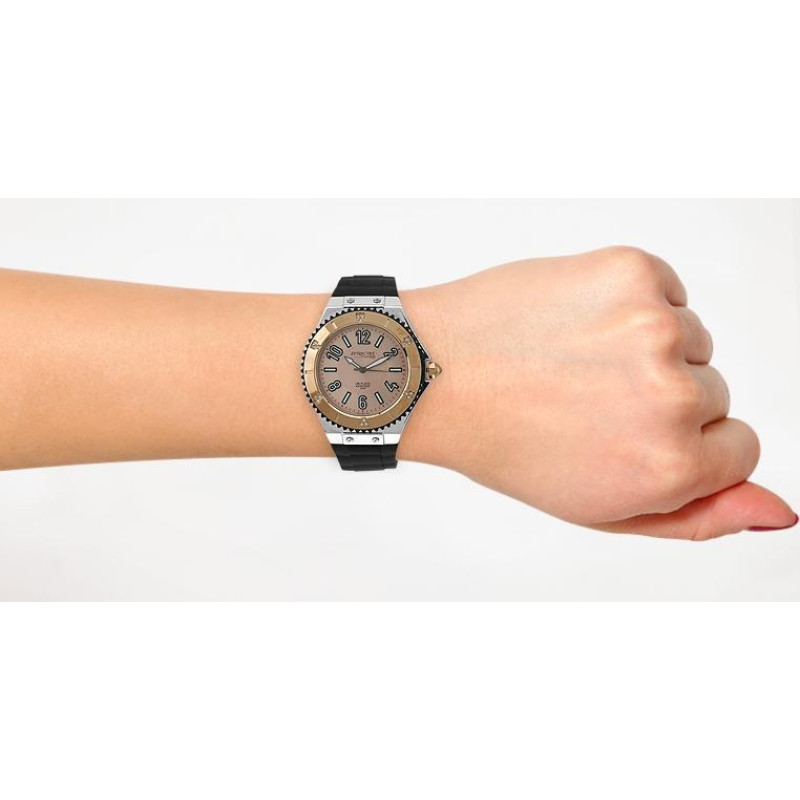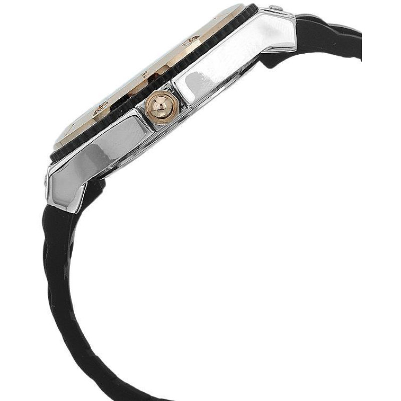 Чёрный силиконовый ремешок. Безель покрыт чёрным и золотым PVD-покрытием, украшен фианитами. Цифербл..