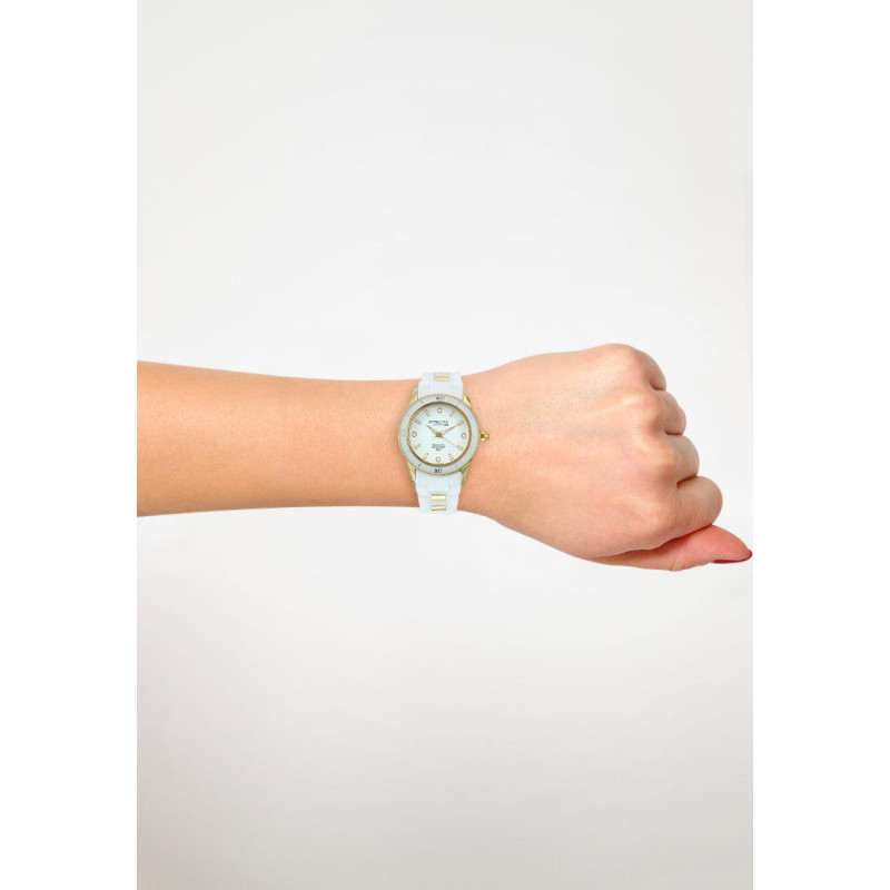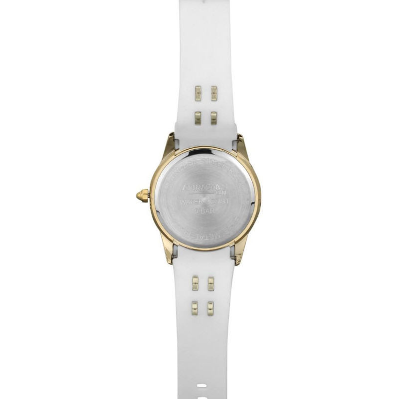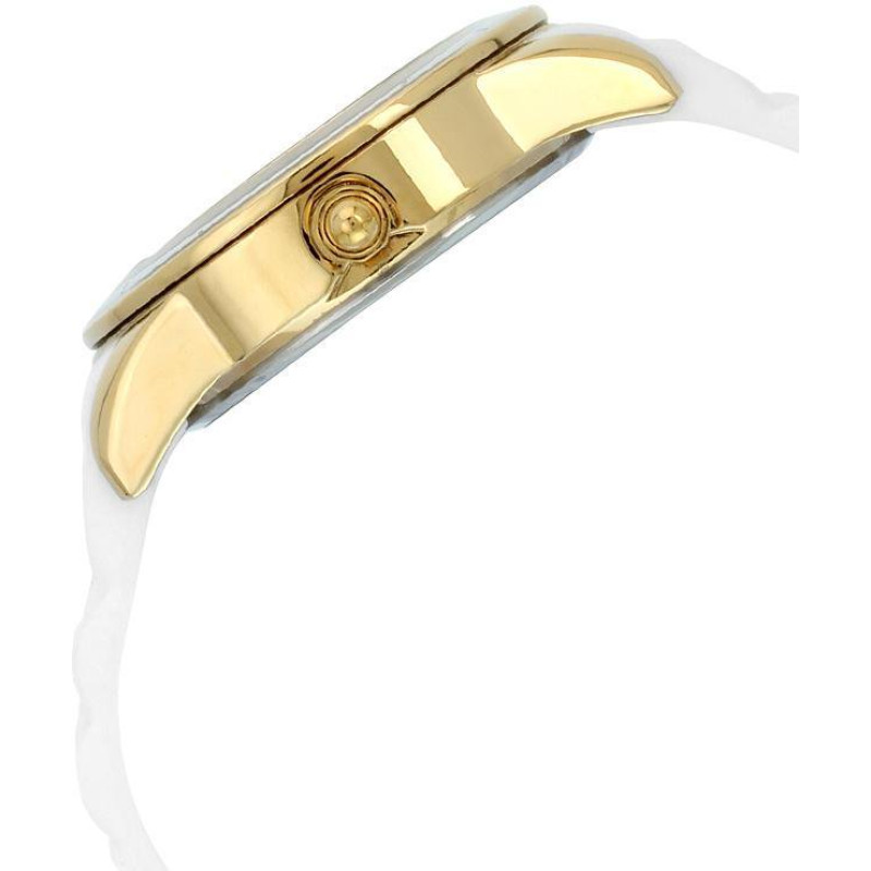 Люминесцентные стрелки. Белый силиконовый ремешок. Корпус покрыт золотым PVD-покрытием. Циферблат ук..