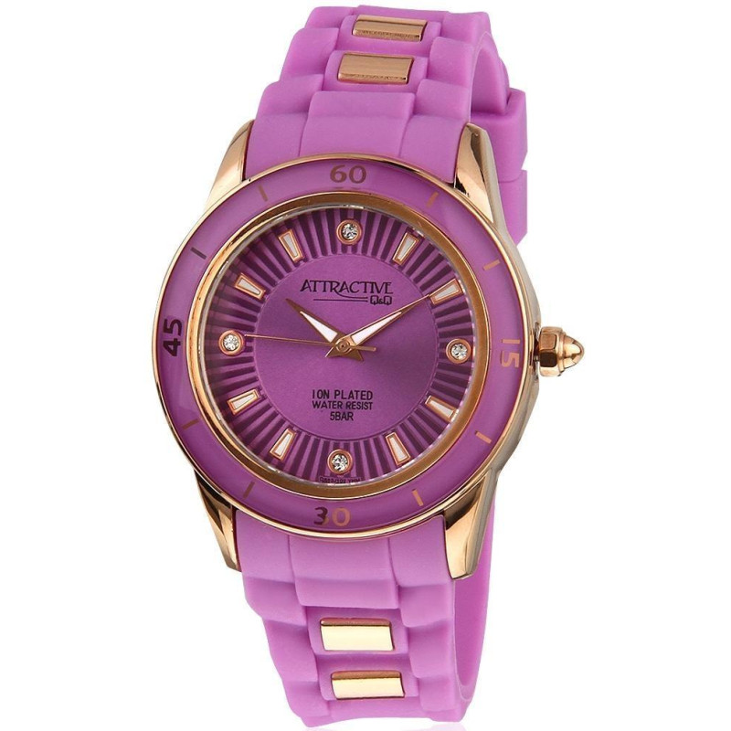 Фиолетовый силиконовый ремешок. Корпус покрыт PVD-покрытием цвета розового цвета. Циферблат — фиолет..