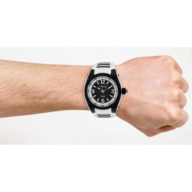 Корпус покрыт чёрным PVD-покрытием. Люминесцентные стрелки. Белый ремешок. Цвет циферблата - чёрный...