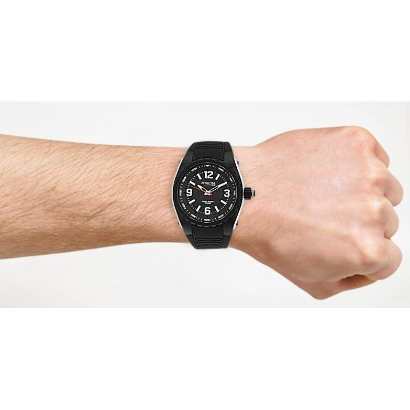 Корпус покрыт чёрным PVD-покрытием. Люминесцентные стрелки. Чёрный ремешок. Цвет циферблата - чёрный..