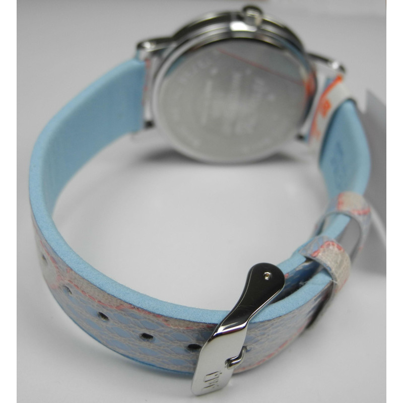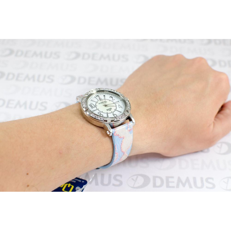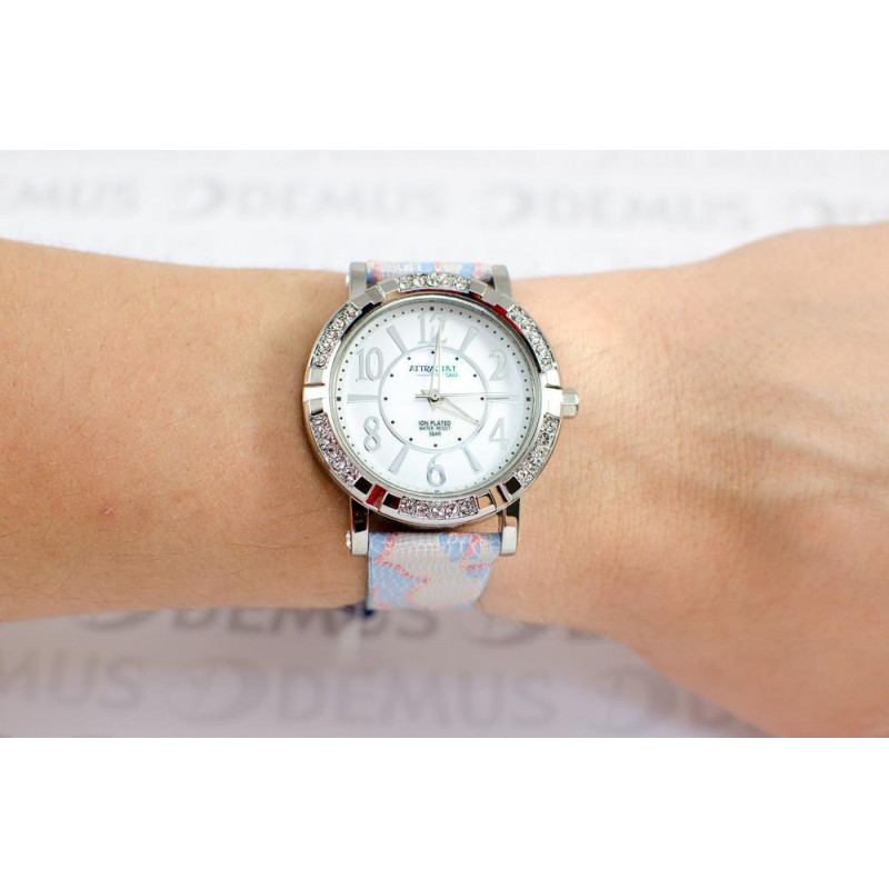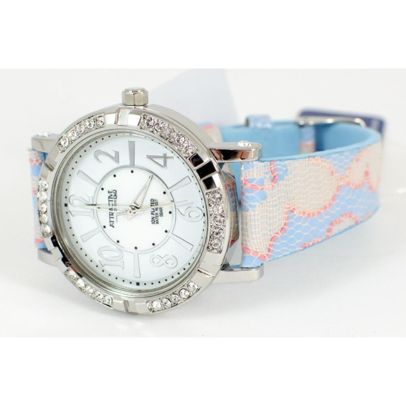 Корпус серебристого цвета, украшен фианитами. Бежево-голубой кожаный ремешок. Цвет циферблата — бело..