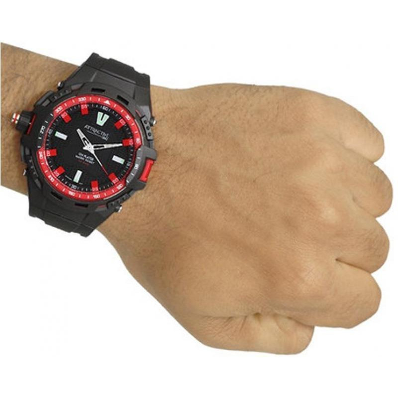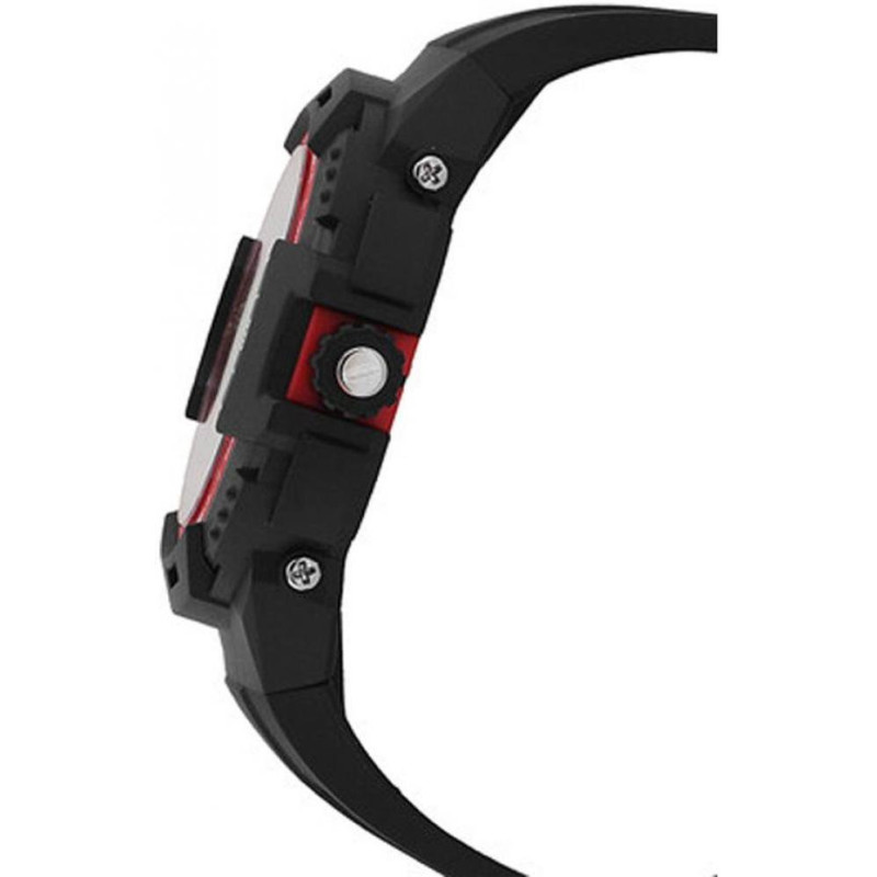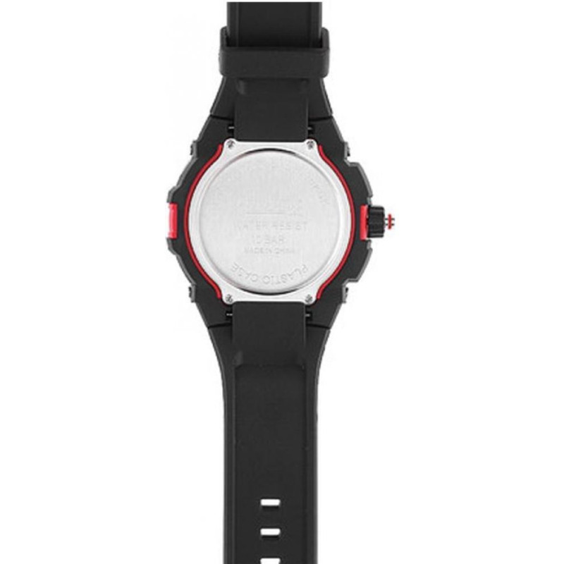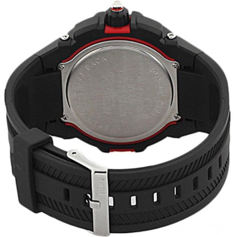 Модель имеет водонепроницаемость 100 м. Корпус выполнен из материала – комбинированный (сталь/пластик). Прочное минеральное стекло надежно защищает циферблат от ударов и других повреждений. Удобный полимер ремешок позволяет часам комфортно сидеть на запястье. Из дополнительных функций имеются: секунды.