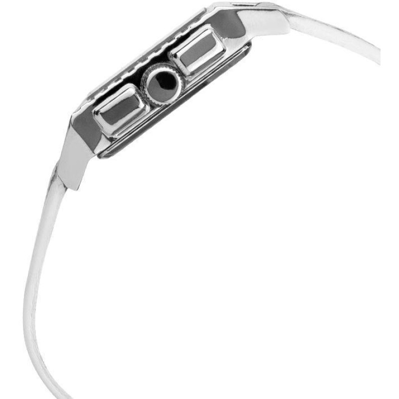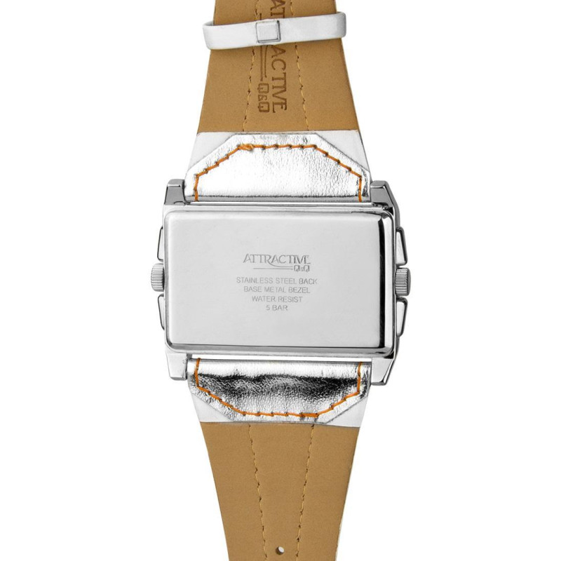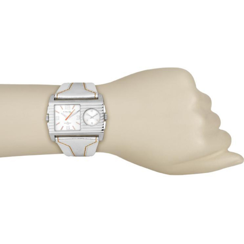 Серебристо-белый кожаный ремешок. Корпус серебристого цвета. Два циферблата - круглый и квадратный. ..