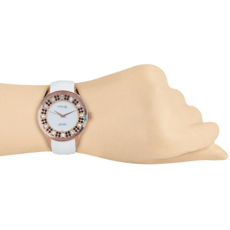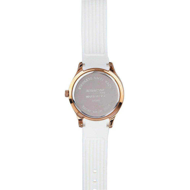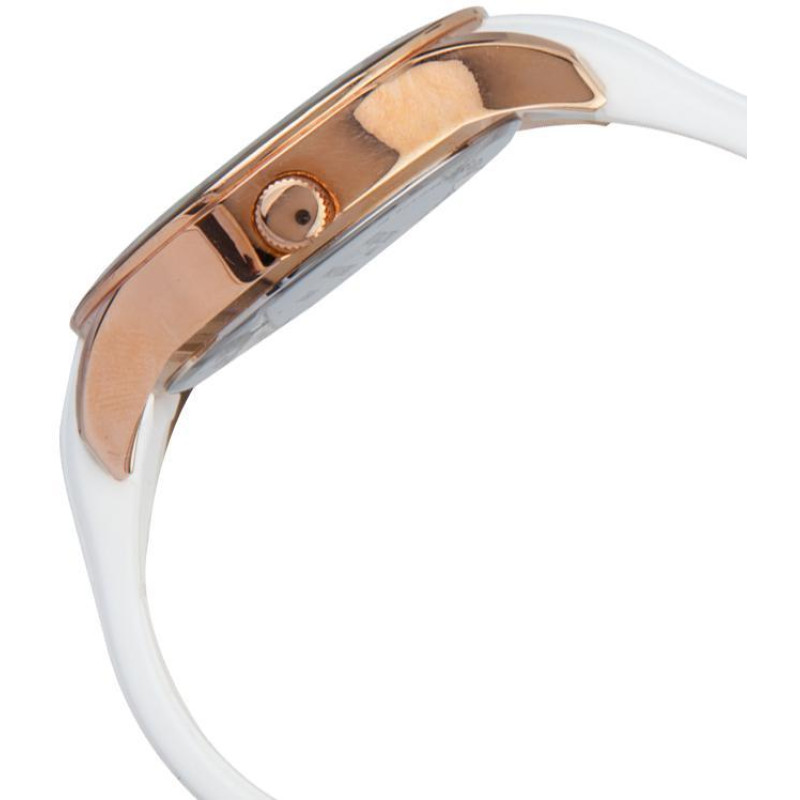 Белый силиконовый ремешок. Корпус покрыт PVD-покрытием цвета розового золота и украшен фианитами. Цв..