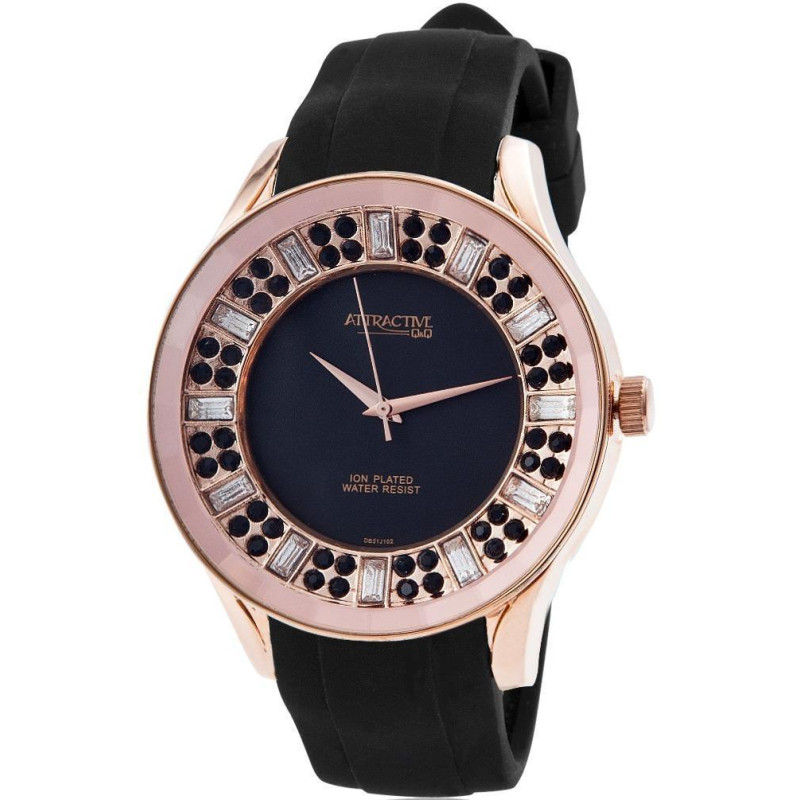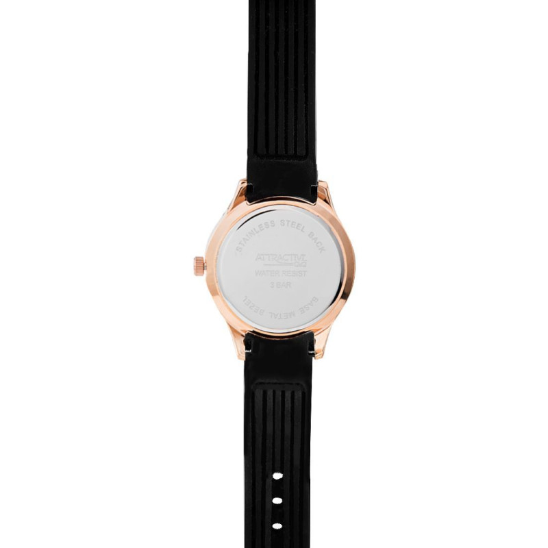 Чёрный силиконовый ремешок. Корпус покрыт PVD-покрытием цвета розового золота и украшен фианитами. Ц..