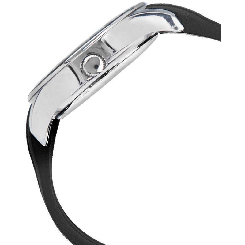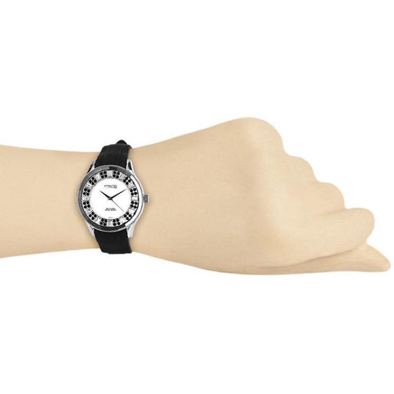 Чёрный силиконовый ремешок. Корпус серебристого цвета и украшен фианитами. Цвет циферблата — белый. ..