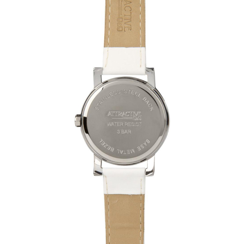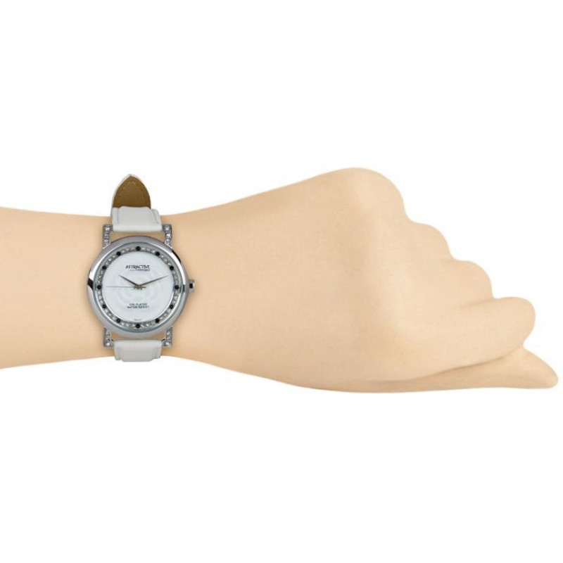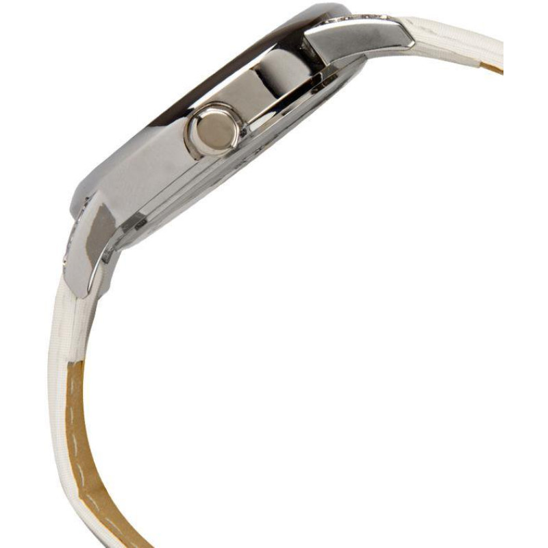 Белый сатиновый ремешок. Корпус украшен фианитами. Цвет циферблата — белый. Вид циферблата — индексы..