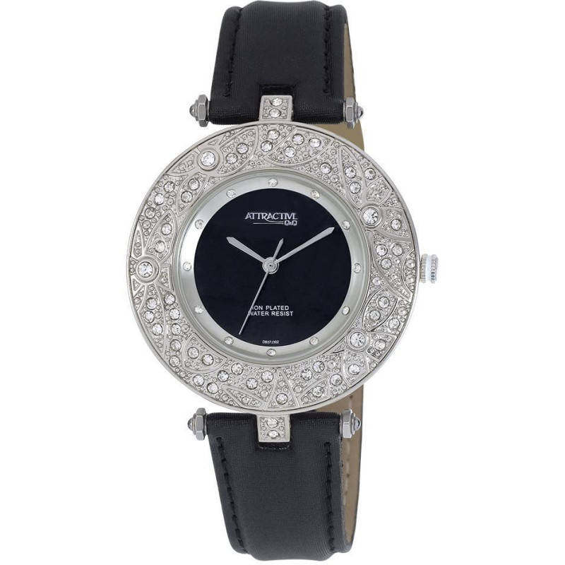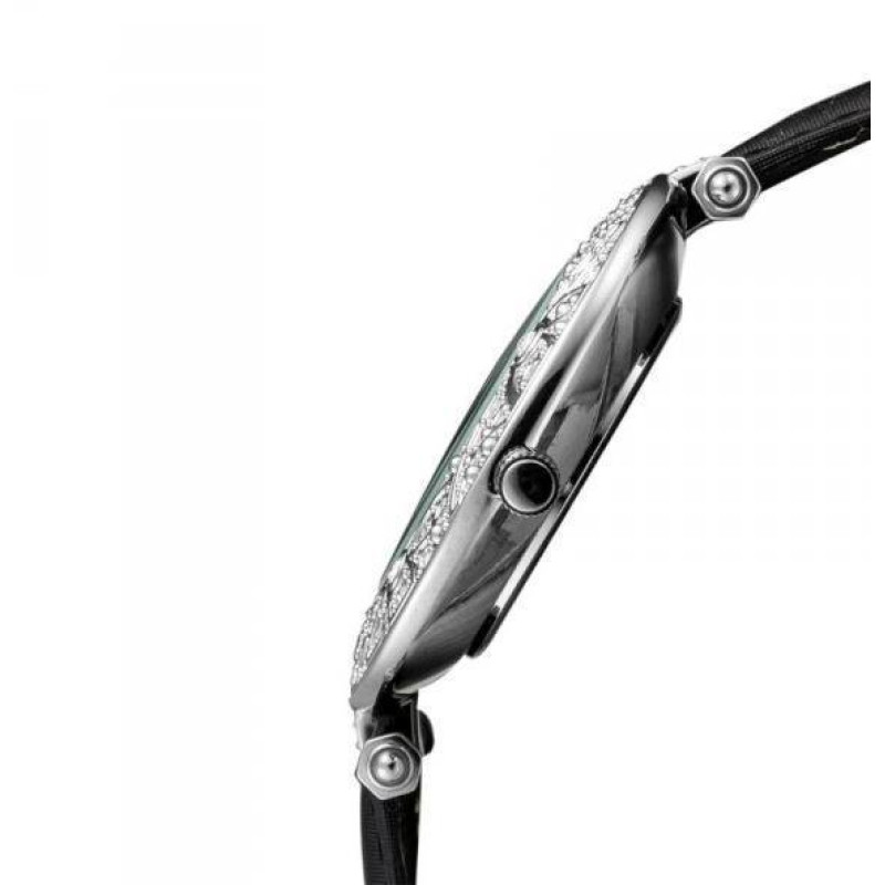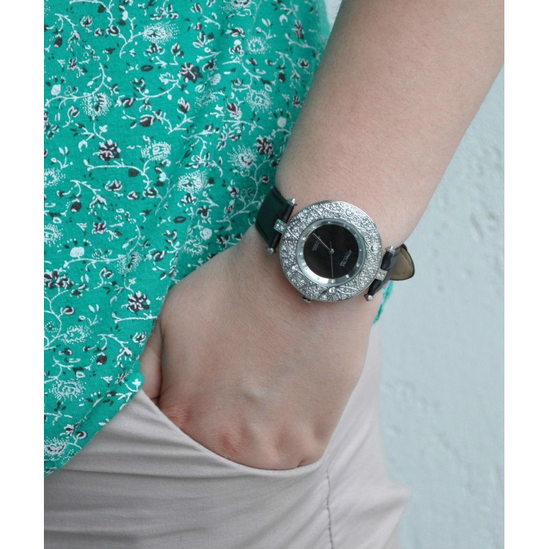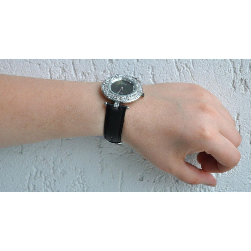 Чёрный сатиновый ремешок. Корпус и иферблат украшены фианитами. Цвет циферблата - чёрный перламутр. ..