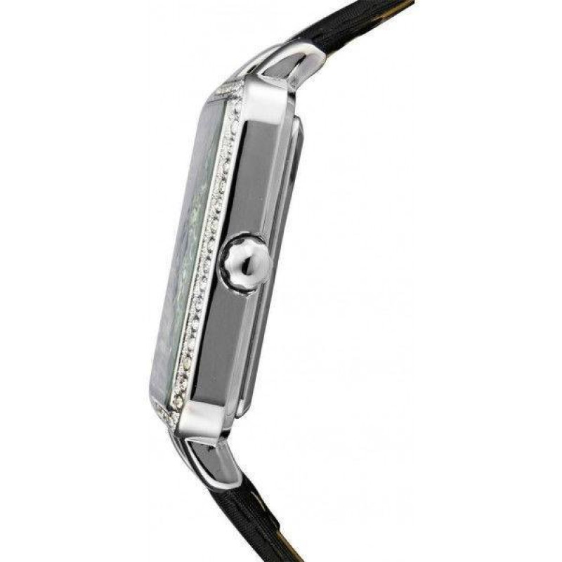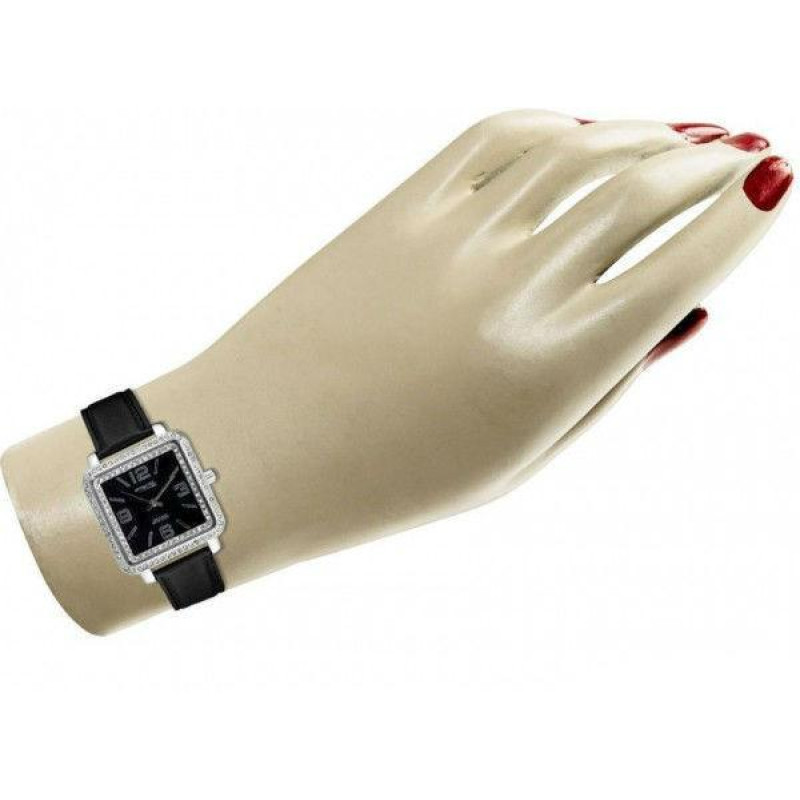 Чёрный сатиновый ремешок. Корпус украшен фианитами. Цвет циферблата — чёрный. Вид циферблата — арабс..