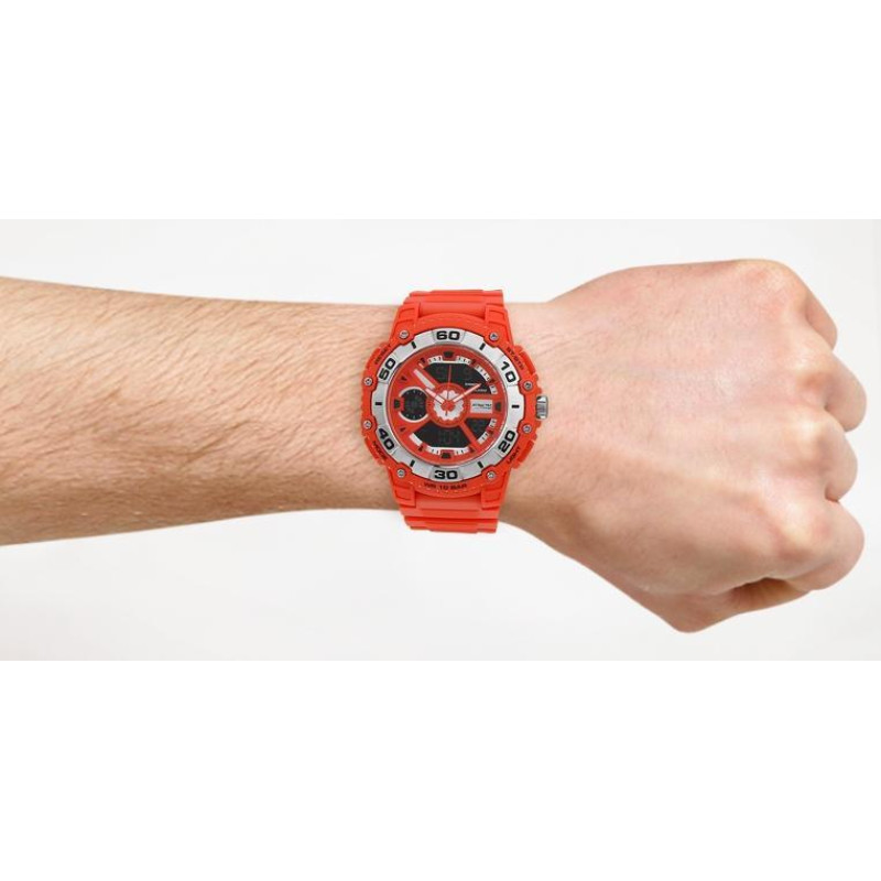 Модель имеет водонепроницаемость 100 м. Корпус выполнен из материала – пластик. Прочное минеральное стекло надежно защищает циферблат от ударов и других повреждений. Удобный полимер ремешок позволяет часам комфортно сидеть на запястье. Из дополнительных функций имеются: автоматический календарь, будильник, дата, двойное время, день недели, секундомер, секунды.