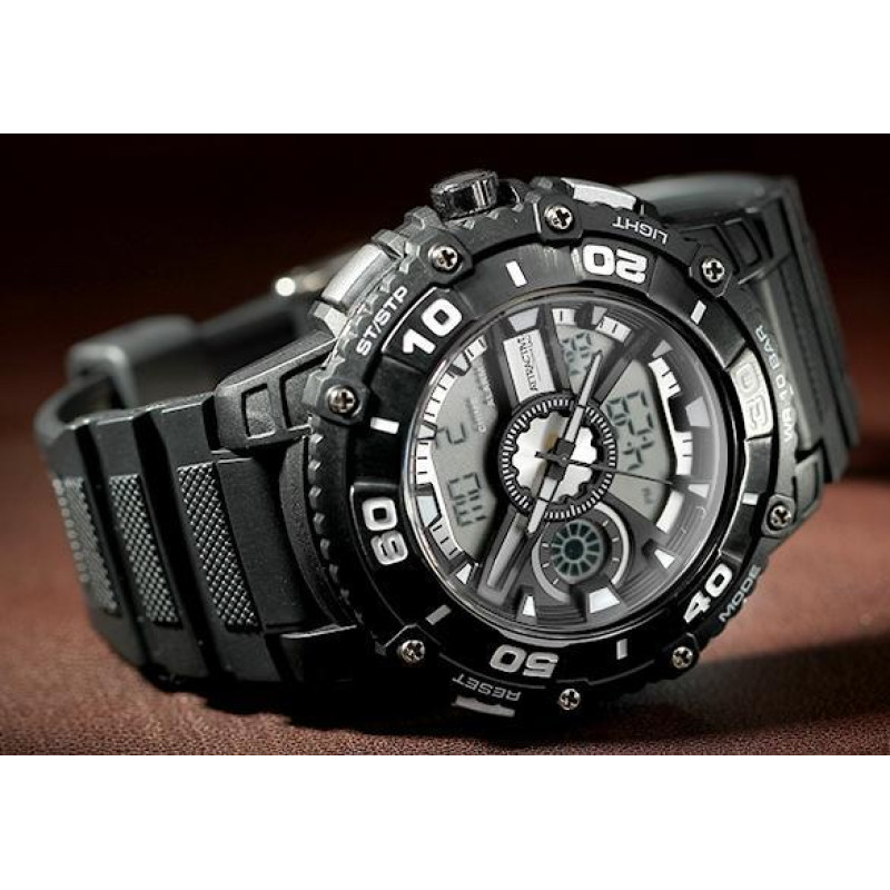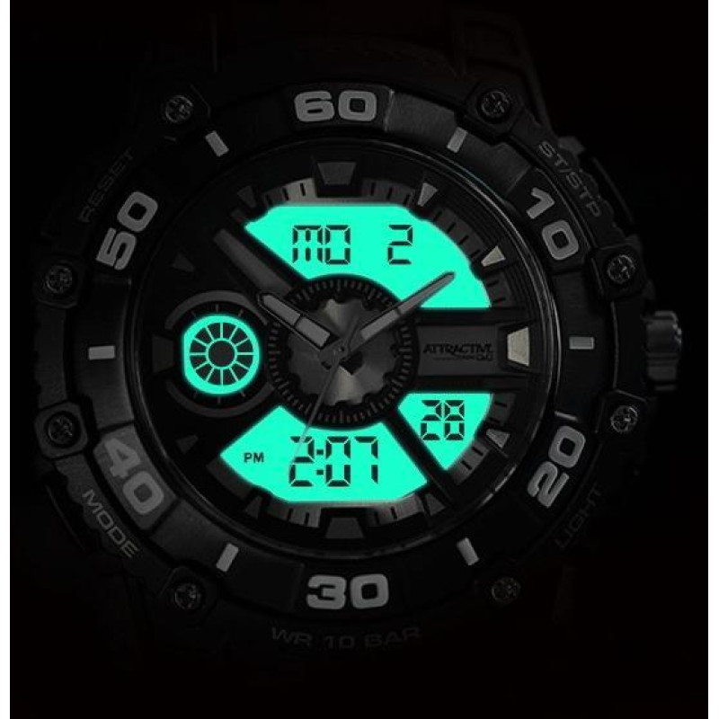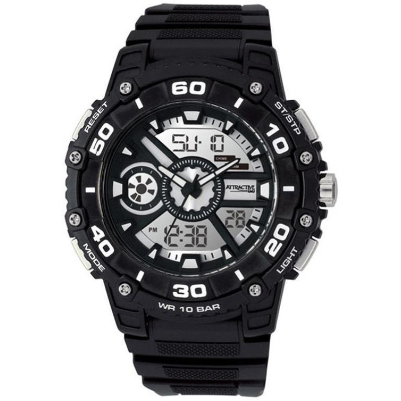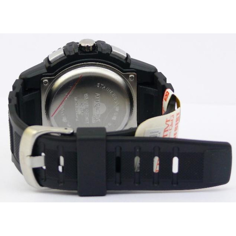 Модель имеет водонепроницаемость 100 м. Корпус выполнен из материала – пластик. Прочное пластиковое стекло надежно защищает циферблат от ударов и других повреждений. Удобный полимер ремешок позволяет часам комфортно сидеть на запястье. Из дополнительных функций имеются: автоматический календарь, будильник, дата, двойное время, день недели, секундомер, секунды.