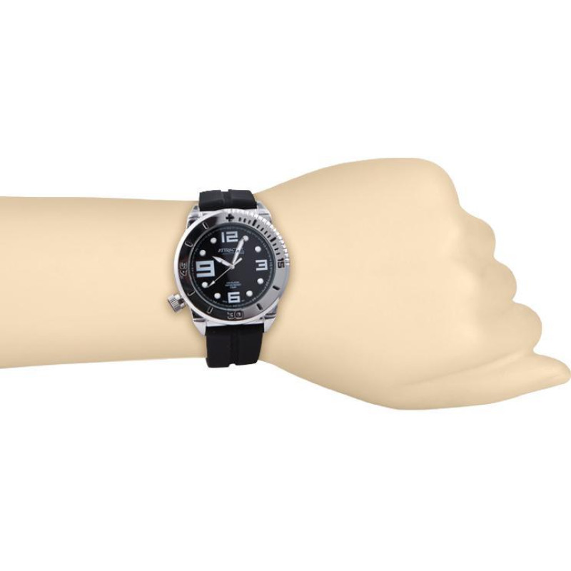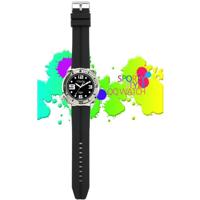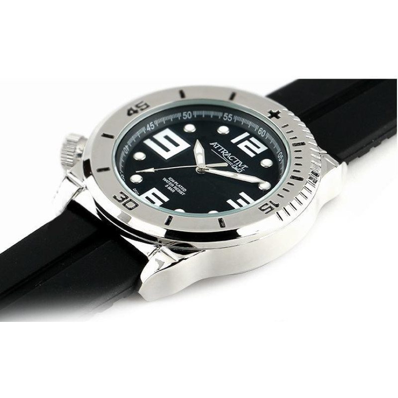 Стрелки с люминесцентным покрытием. Корпус серебристого цвета. Чёрный ремешок. Цвет циферблата — чёр..