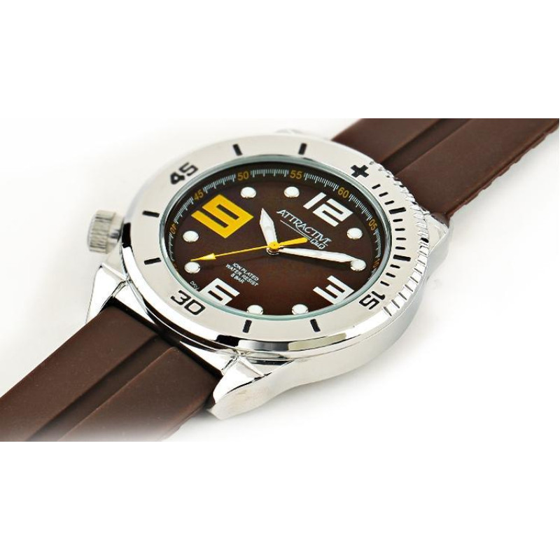 Стрелки с люминесцентным покрытием. Корпус серебристого цвета. Коричневый ремешок. Цвет циферблата —..