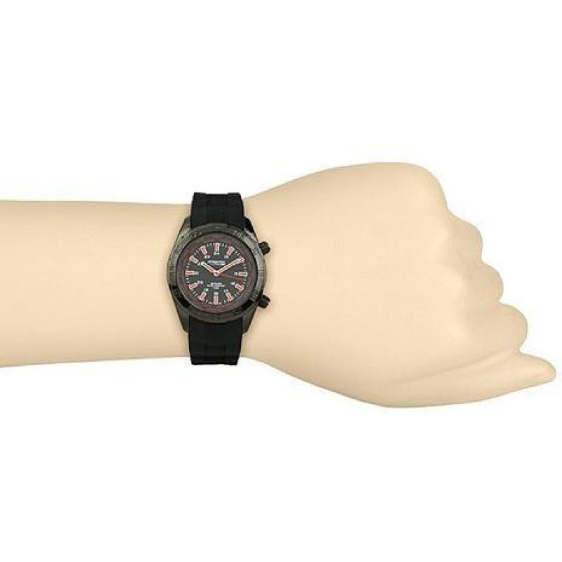 Корпус покрыт чёрным PVD-покрытием. Чёрный ремешок. Цвет циферблата — чёрный. Вид циферблата — арабс..