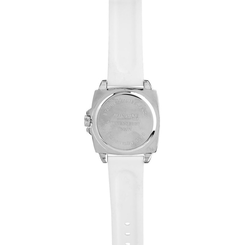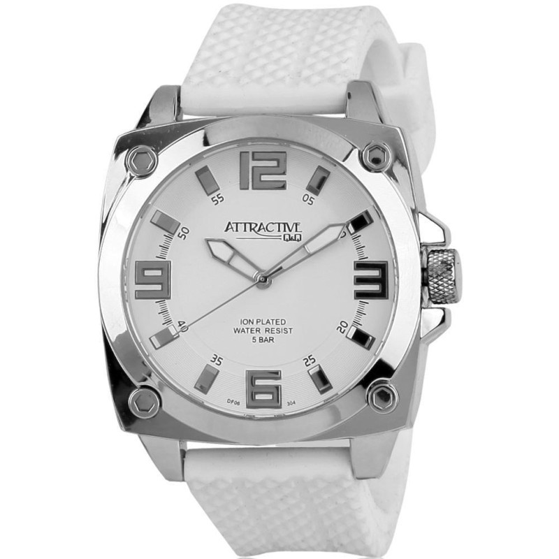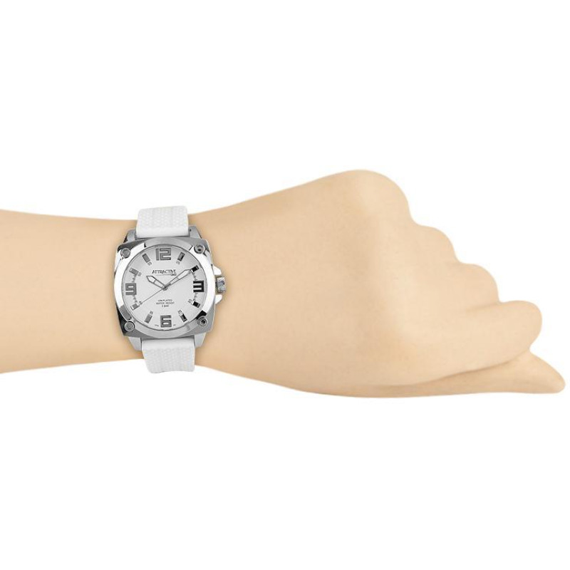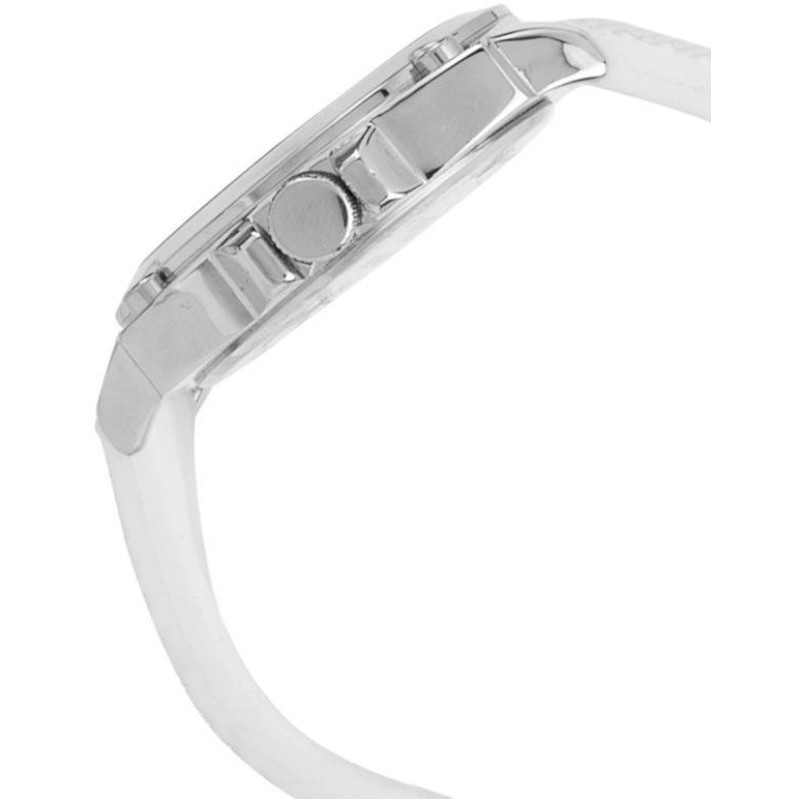 Белый силиконовый ремешок. Корпус серебристого цвета. Циферблат — белого цвета. Вид циферблата — ара..