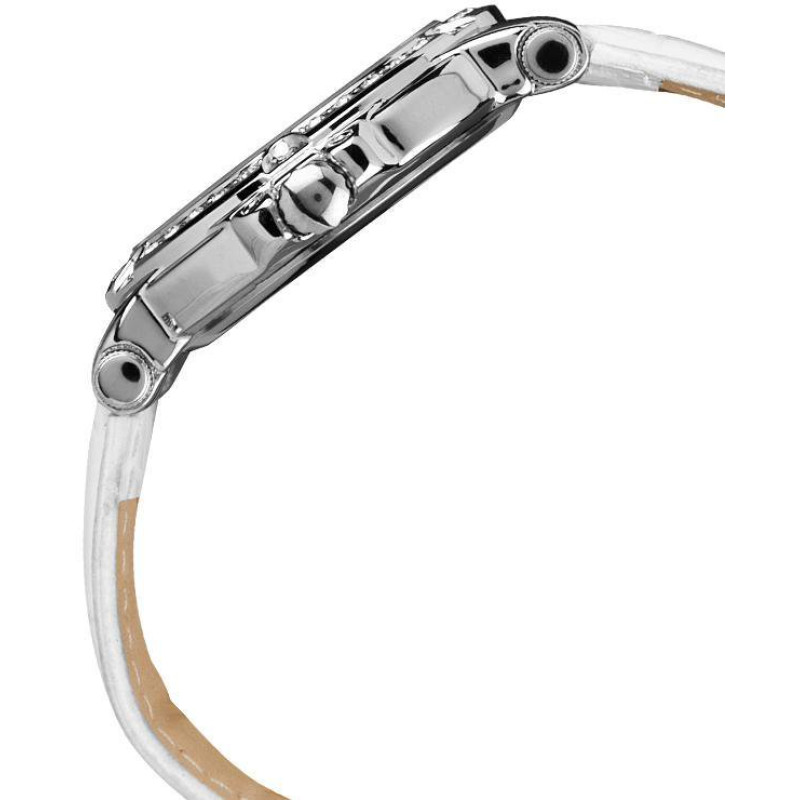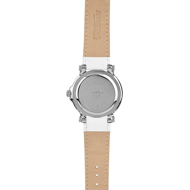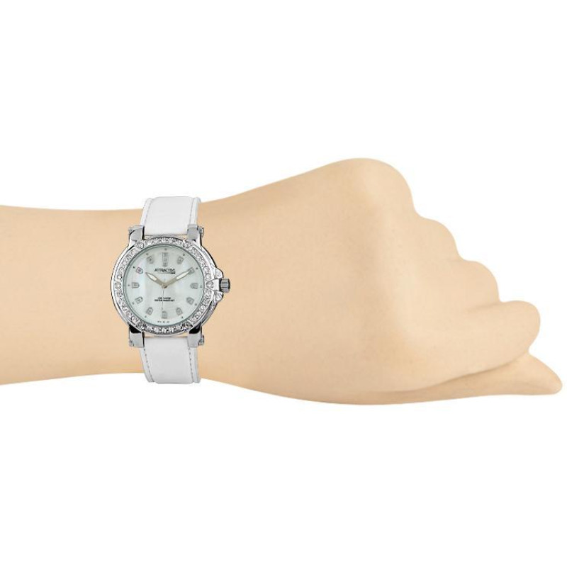 Люминесцентные стрелки. Белый кожаный ремешок. Корпус украшен фианитами. Цвет циферблата — перламутр..
