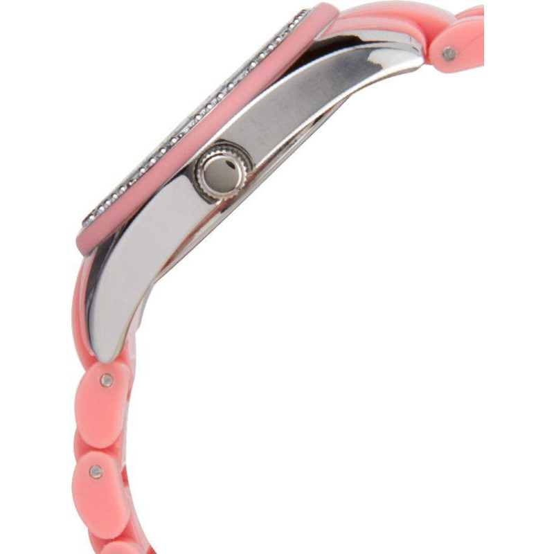 Розовый пластиковый ремешок. Корпус украшен фианитами. Цвет циферблата — розовый. Вид циферблата — и..