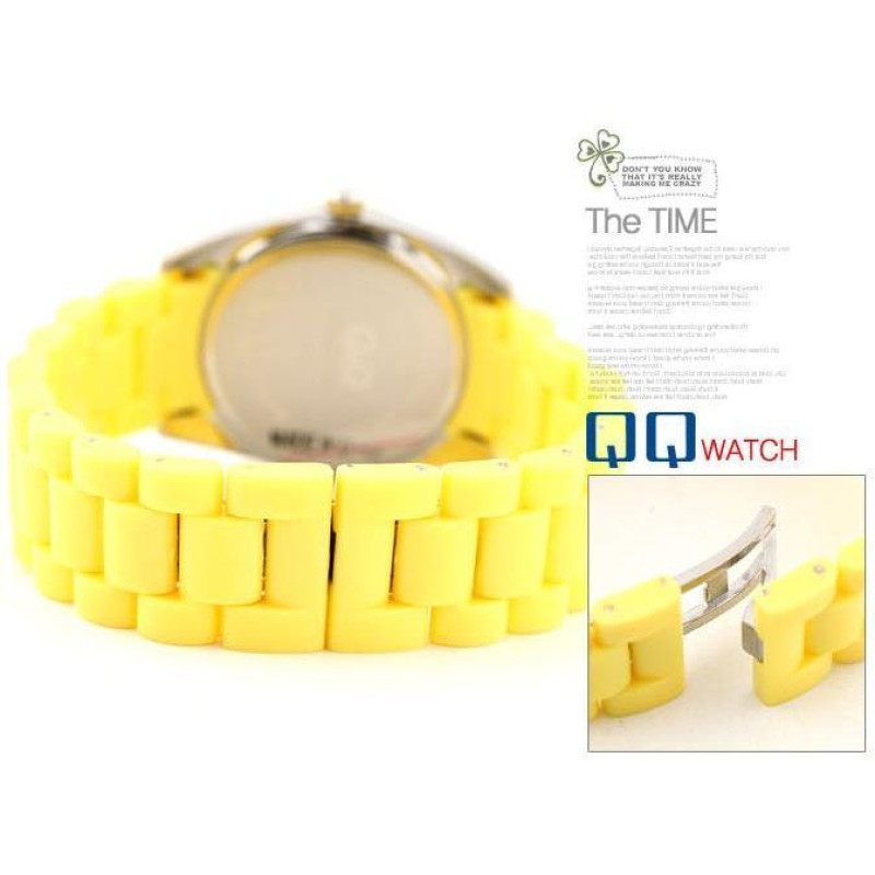Жёлтый пластиковый ремешок. Корпус украшен фианитами. Цвет циферблата — жёлтый. Вид циферблата — инд..