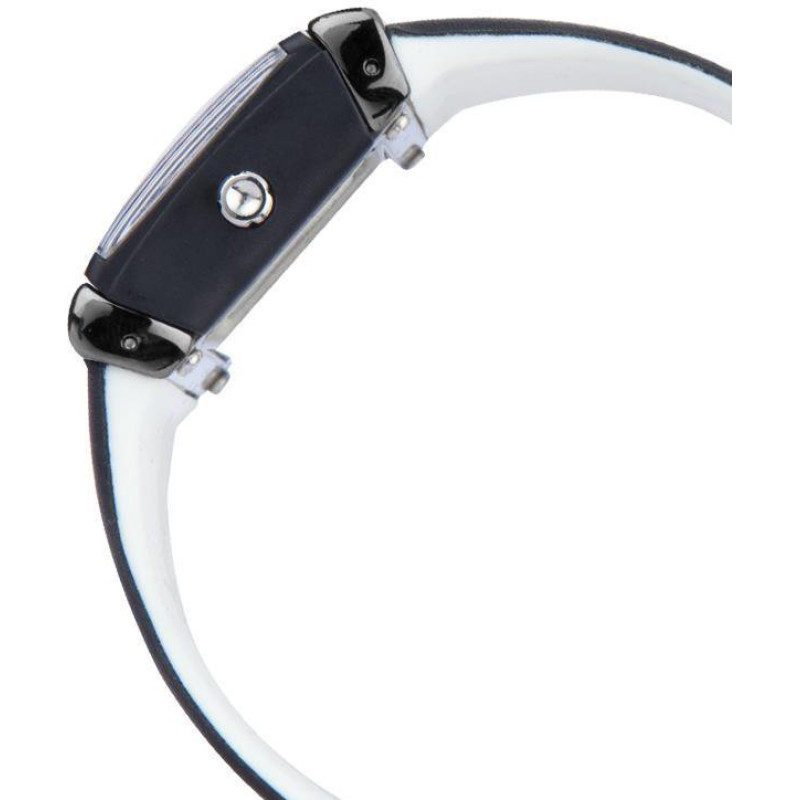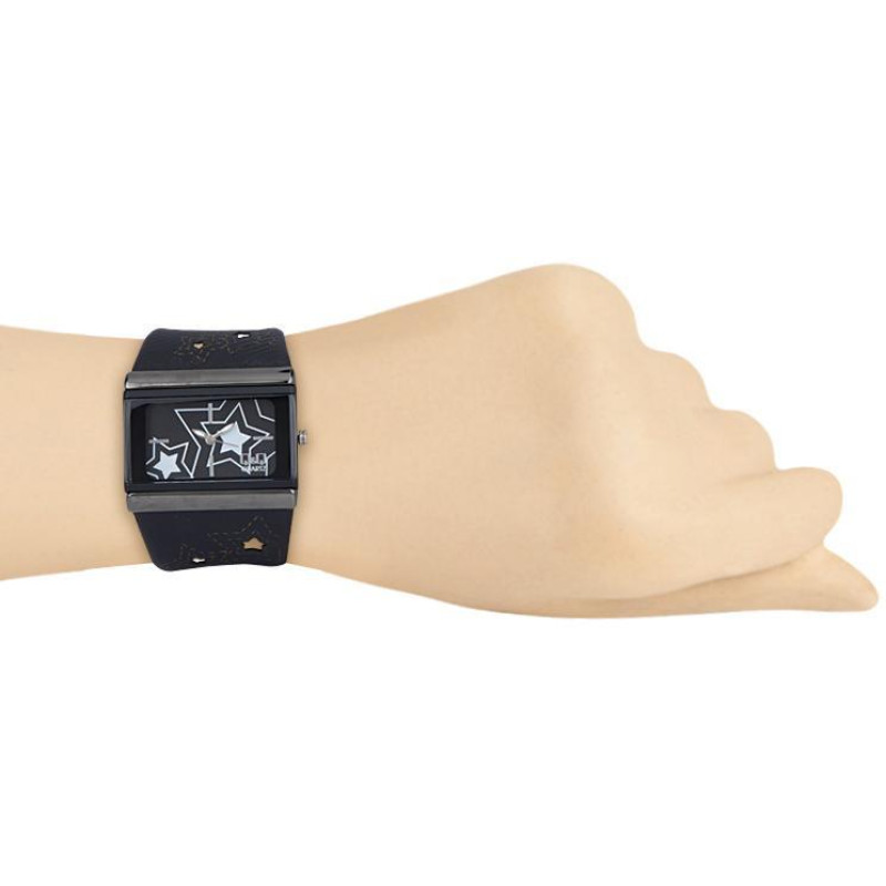 Чёрно-белый полимерный ремешок. Циферблат чёрного цвета и украшен белыми звёздочками. Вид циферблата..