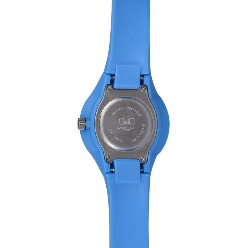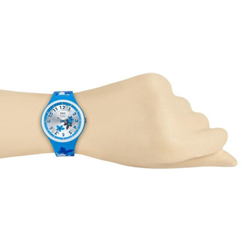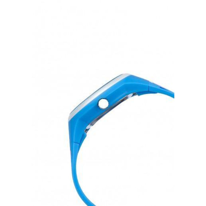 Ремешок силиконовый, голубого цвета. Циферблат — голубого и серебристого цвета. Вид циферблата — ара..