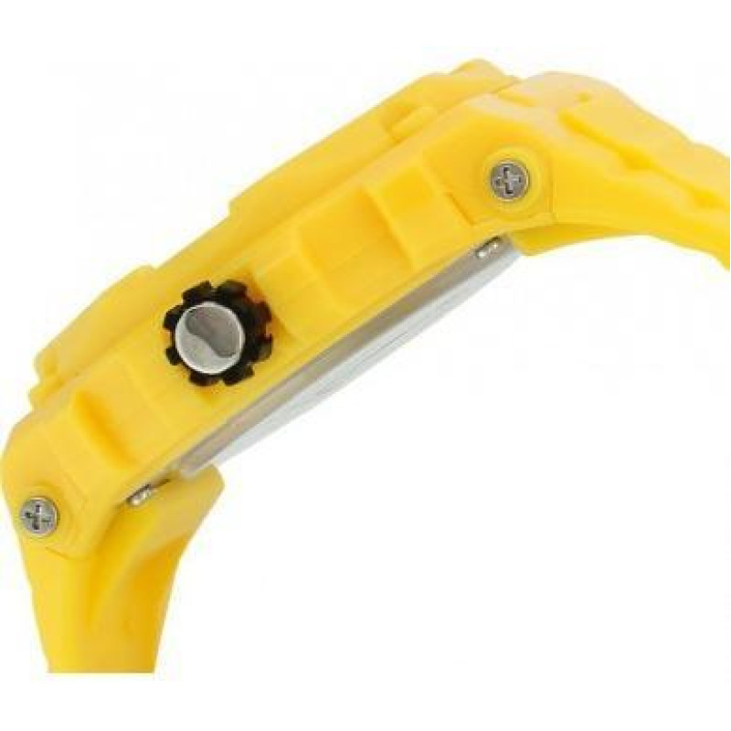 Корпус из латуни и пластика, жёлтого цвета. Ремешок каучук, жёлтого цвета. Циферблат — чёрного цвета..