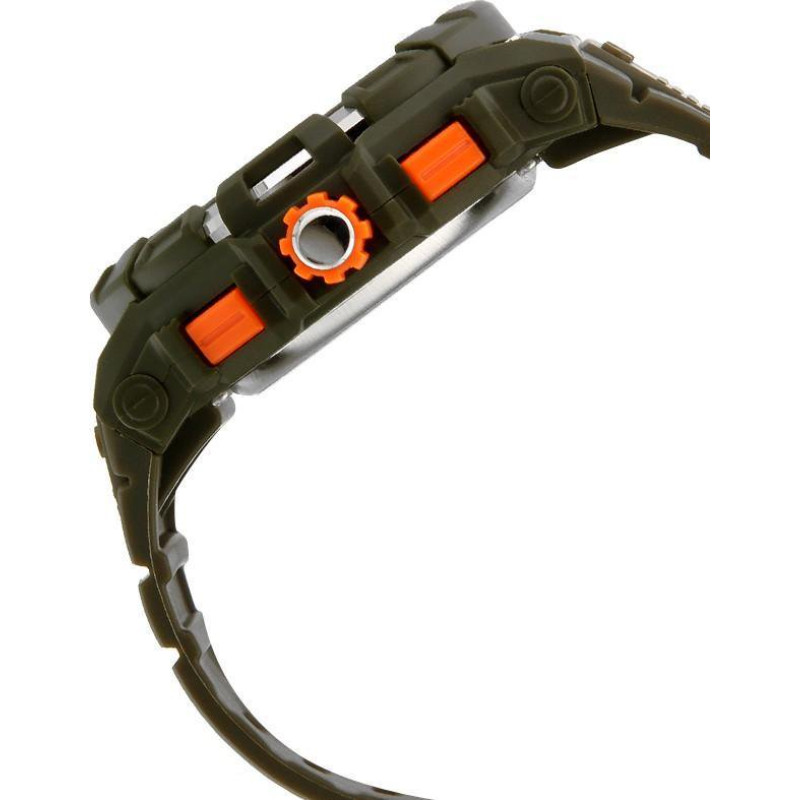 Модель имеет водонепроницаемость 100 м. Корпус выполнен из материала – комбинированный (сталь/пластик). Прочное пластиковое стекло надежно защищает циферблат от ударов и других повреждений. Удобный полимер ремешок позволяет часам комфортно сидеть на запястье. Из дополнительных функций имеются: будильник, дата, день недели, ежечасный сигнал, календарь, секундомер, секунды, таймер, электролюминесцентная подсветка.