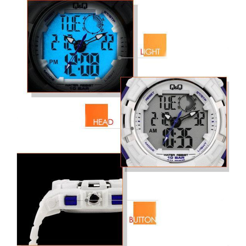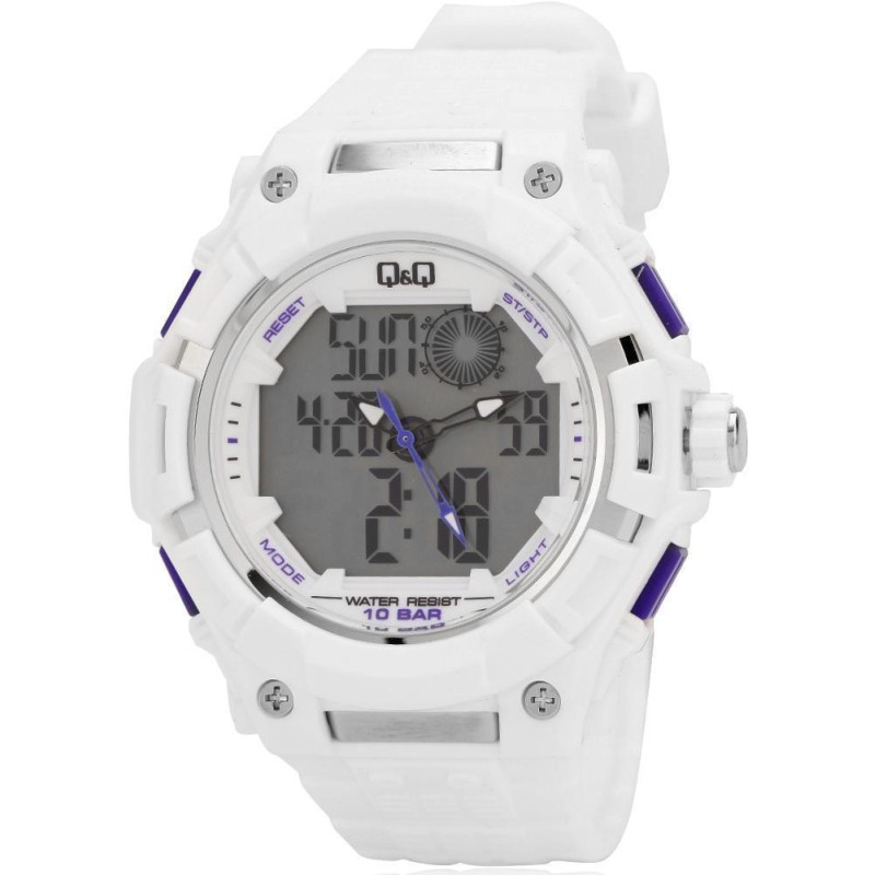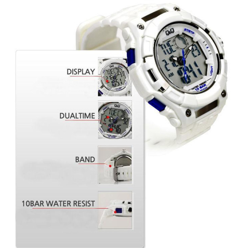 Модель имеет водонепроницаемость 100 м. Корпус выполнен из материала – пластик. Прочное минеральное стекло надежно защищает циферблат от ударов и других повреждений. Удобный полимер ремешок позволяет часам комфортно сидеть на запястье. Из дополнительных функций имеются: 12 и 24-часовой формат времени, будильник, дата, день недели, секундомер, секунды.