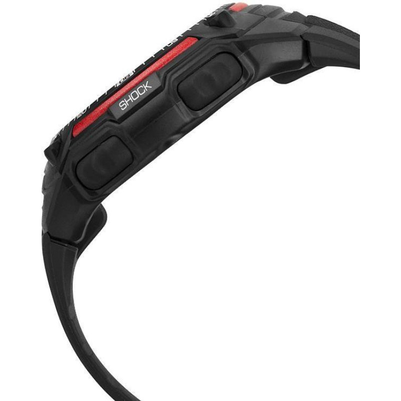 Модель имеет водонепроницаемость 100 м. Корпус выполнен из материала – комбинированный (сталь/пластик). Прочное пластиковое стекло надежно защищает циферблат от ударов и других повреждений. Удобный полимер ремешок позволяет часам комфортно сидеть на запястье. Из дополнительных функций имеются: будильник, дата, день недели, месяц, секундомер, таймер.