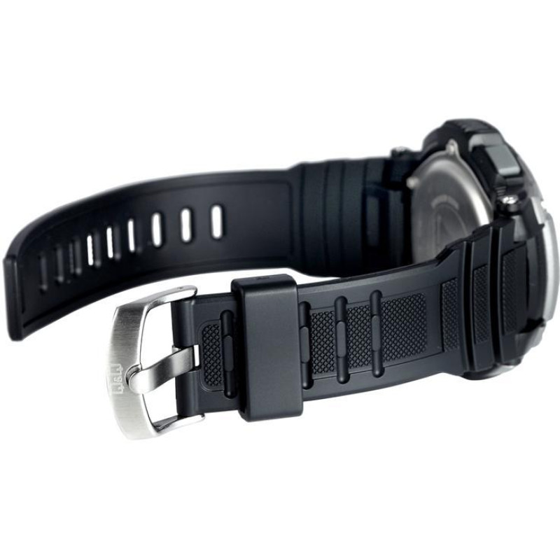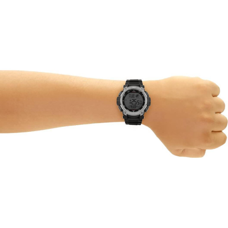Модель имеет водонепроницаемость 100 м. Корпус выполнен из материала – комбинированный (сталь/пластик). Прочное пластиковое стекло надежно защищает циферблат от ударов и других повреждений. Удобный полимер ремешок позволяет часам комфортно сидеть на запястье. Из дополнительных функций имеются: будильник, дата, день недели, месяц, секундомер, таймер.