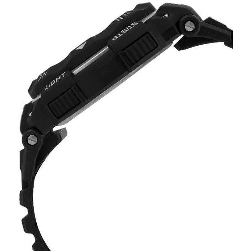 Модель имеет водонепроницаемость 100 м. Корпус выполнен из материала – комбинированный (сталь/пластик). Прочное пластиковое стекло надежно защищает циферблат от ударов и других повреждений. Удобный полимер ремешок позволяет часам комфортно сидеть на запястье. Из дополнительных функций имеются: будильник, дата, день недели, секундомер, секунды, таймер, электролюминесцентная подсветка.