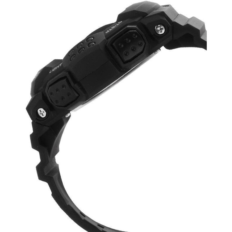 Модель имеет водонепроницаемость 100 м. Корпус выполнен из материала – комбинированный (сталь/пластик). Прочное минеральное стекло надежно защищает циферблат от ударов и других повреждений. Удобный полимер ремешок позволяет часам комфортно сидеть на запястье. Из дополнительных функций имеются: будильник, дата, день недели, месяц, секундомер.