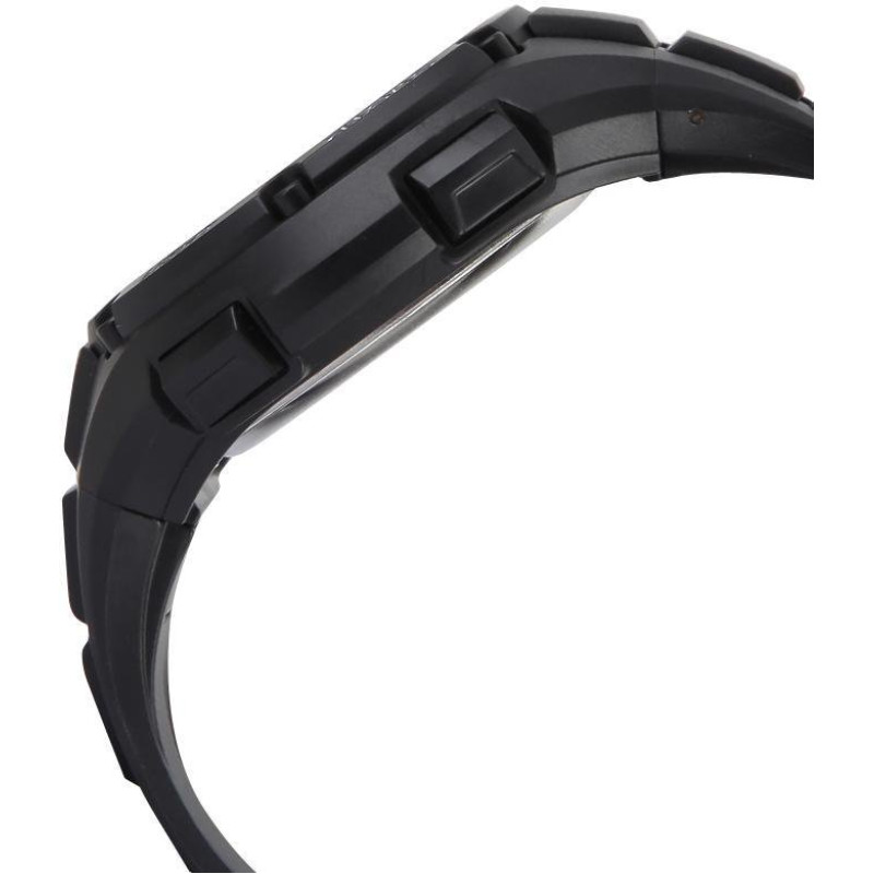 Модель имеет водонепроницаемость 100 м. Корпус выполнен из материала – комбинированный (сталь/пластик). Удобный полимер ремешок позволяет часам комфортно сидеть на запястье. Из дополнительных функций имеются: будильник, дата, день недели, месяц, секундомер.