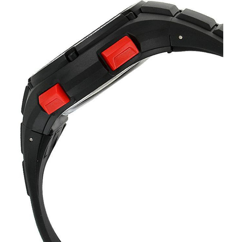 Модель имеет водонепроницаемость 100 м. Корпус выполнен из материала – пластик. Прочное пластиковое стекло надежно защищает циферблат от ударов и других повреждений. Удобный пластик ремешок позволяет часам комфортно сидеть на запястье. Из дополнительных функций имеются: будильник, дата, день недели, месяц, секунды, хронометр, электролюминесцентная подсветка.