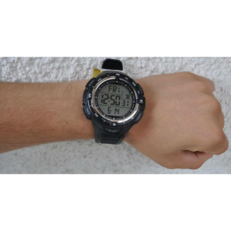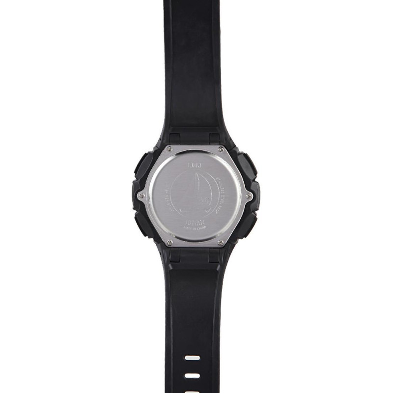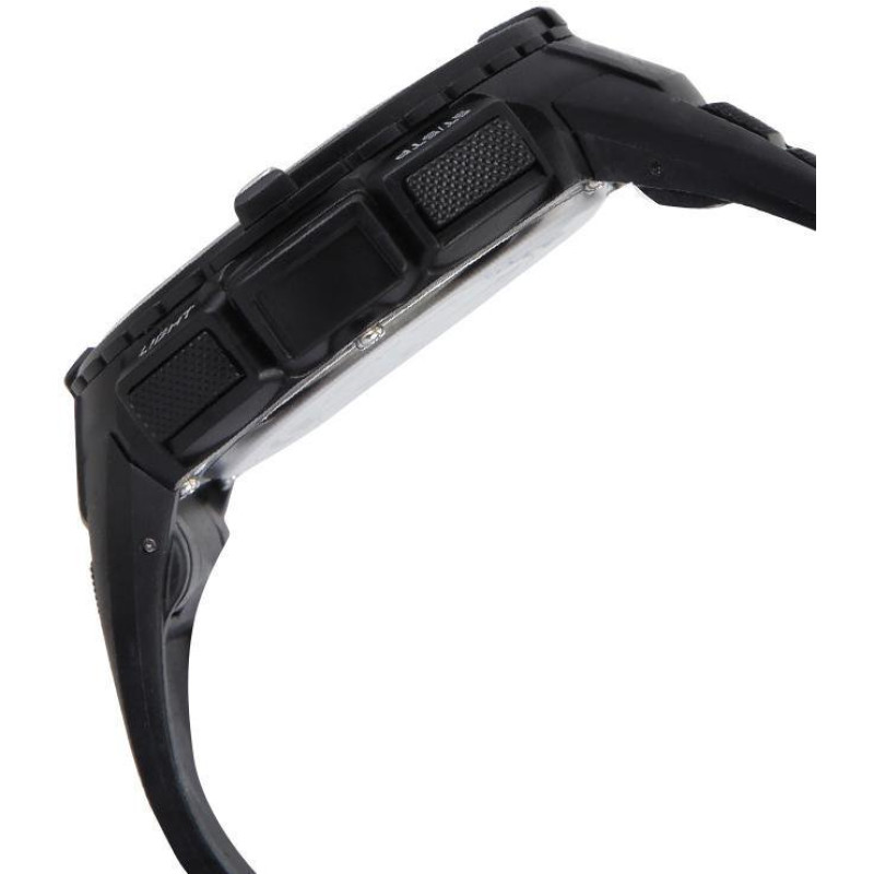 Модель имеет водонепроницаемость 100 м. Корпус выполнен из материала – пластик. Прочное пластиковое стекло надежно защищает циферблат от ударов и других повреждений. Удобный полимер ремешок позволяет часам комфортно сидеть на запястье. Из дополнительных функций имеются: 12 и 24-часовой формат времени, будильник, дата, день недели, секундомер, секунды.