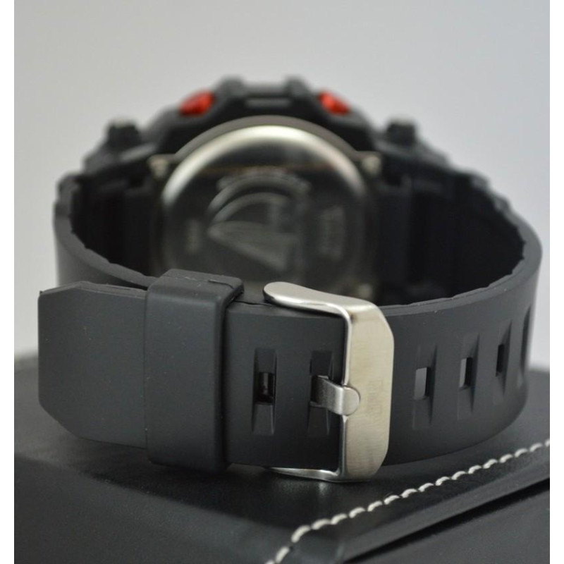 Модель имеет водонепроницаемость 100 м. Корпус выполнен из материала – пластик. Прочное минеральное стекло надежно защищает циферблат от ударов и других повреждений. Удобный полимер ремешок позволяет часам комфортно сидеть на запястье. Из дополнительных функций имеются: 12 и 24-часовой формат времени, будильник, дата, день недели, секундомер, секунды.