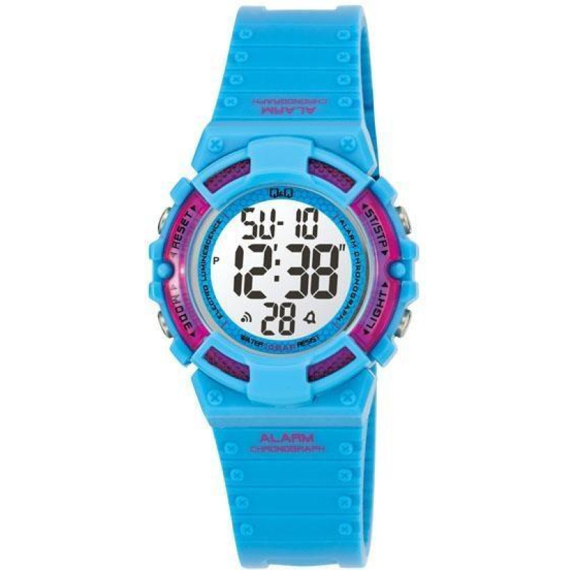 Модель имеет водонепроницаемость 100 м. Корпус выполнен из материала – пластик. Прочное минеральное стекло надежно защищает циферблат от ударов и других повреждений. Удобный полимер ремешок позволяет часам комфортно сидеть на запястье. Из дополнительных функций имеются: 12 и 24-часовой формат времени, будильник, дата, день недели, секундомер, секунды.