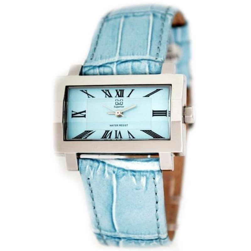 Голубой кожаный ремешок. Корпус серебристого цвета. Циферблат — голубого цвета. Вид циферблата — рим..