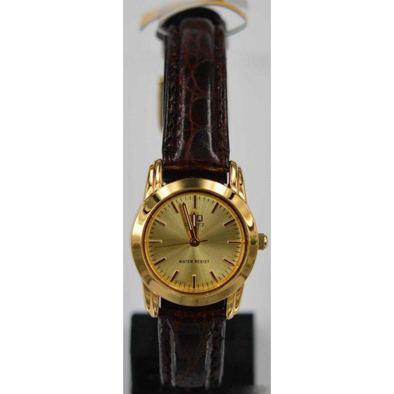 Коричневый кожаный ремешок. Цвет циферблата — золото. Вид циферблата — индексы. Тип батарейки — SR62..